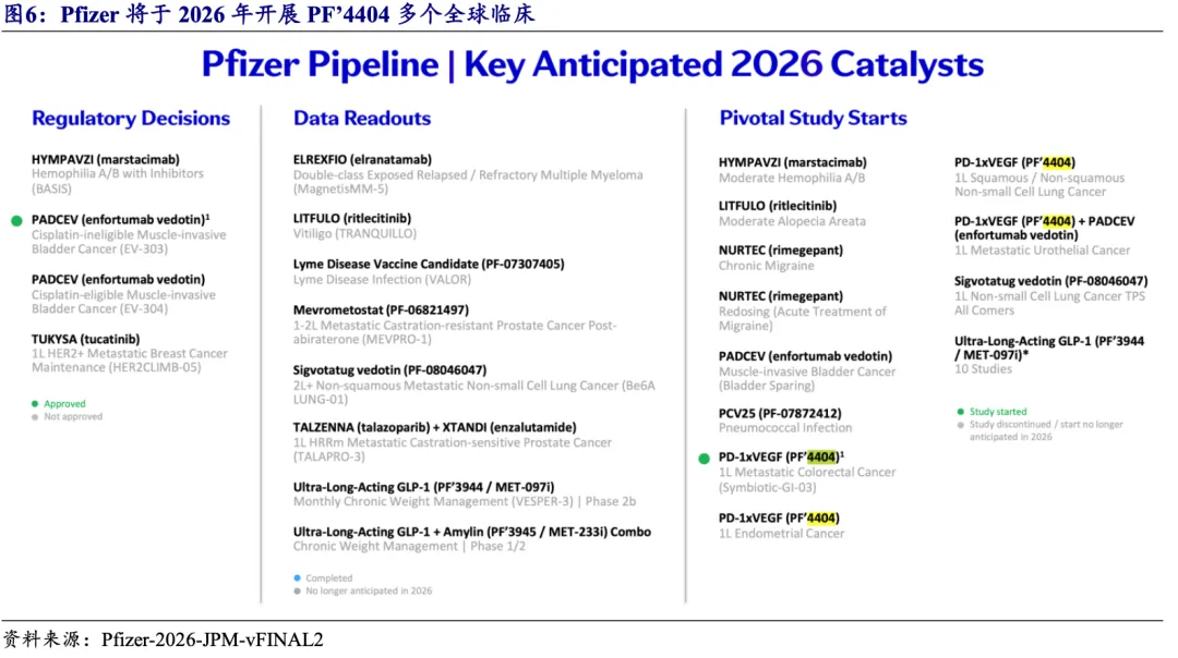 SSGJ-707(PF’4404):辉瑞自引进SSGJ-707(PF’4404)后加速开展全球临床,2025H2已经开展三项全球注册及三项早期临床试验;辉瑞并于2026 JPM大会更新2026年临床开展计划,PF’4404将于2026年开展4项III期研究,覆盖结直肠癌、子宫内膜癌等多个实体瘤,其中一项将与PADCEV联合用于膀胱癌。