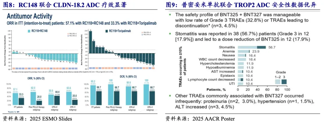 PD-(L)1/VEGF双抗联合ADC药物方案数据较少,但疗效及安全性俱佳。截至2026年1月,PD-(L)1/VEGF双抗联合ADC药物方案仅披露两项临床数据,分别是荣昌生物RC148联合其CLDN-18.2 ADC在2/3L CLDN 18.2阳性胃癌患者中I/II期数据,及BioNTech普密妥米单抗联合映恩生物TROP2 ADC在2L+卵巢上皮癌等实体瘤患者中的I/II期数据。在2/3L CLDN 18.2阳性胃癌患者中,CLDN-18.2 ADC联合RC148治疗获益显著优于联合特瑞普利单抗(PD-1单抗),患者ORR和mPFS分别是57.1% vs 33.3%、7.9m vs 4.3m。普密妥米单抗联合TROP2 ADC在67例实体瘤患者中的安全性数据优异,三级以上TRAE仅32.8%,期待2026年更多有效性数据。