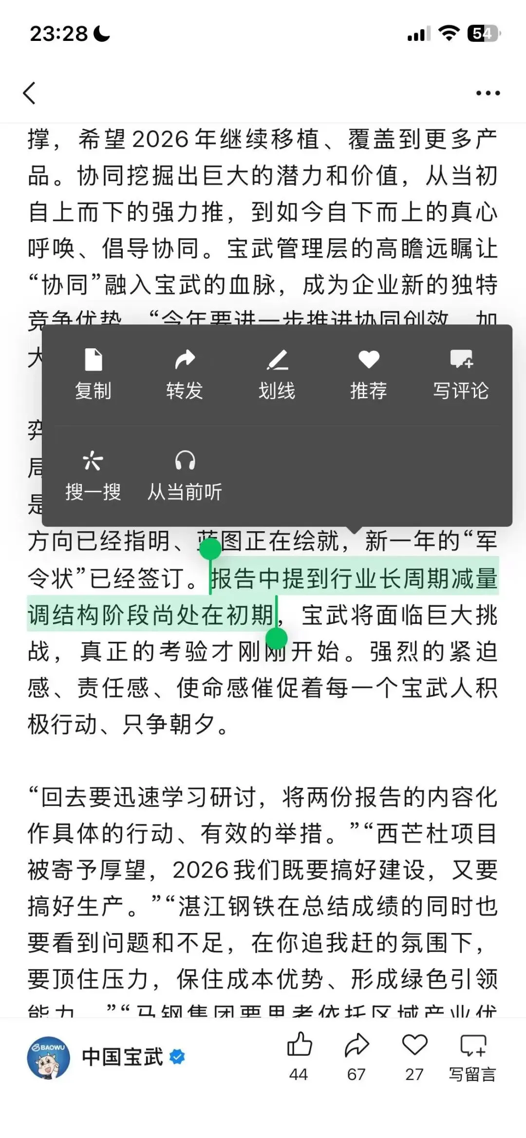 弈贵先手,谋在开局。2026年是“十五五”开局之年,也是宝武三年任期制收官之年,更是宝武高质量发展新阶段极具挑战的一年。方向已经指明、蓝图正在绘就,新一年的“军令状”已经签订。报告中提到行业长周期减量调结构阶段尚处在初期,宝武将面临巨大挑战,真正的考验才刚刚开始。强烈的紧迫感、责任感、使命感催促着每一个宝武人积极行动、只争朝夕。
