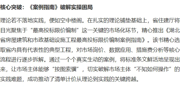 随着《湖北省建设工程工程量清单计价指引(2026)》《湖北省园林绿化工程投资估算指标(试行)》《湖北省房屋建筑和市政基础设施工程最高投标限价编制案例指南》以及《建设工程工程量清单计价(GB/T 50500—2024)及计算标准应用与实务》等一系列规范与专著的陆续发布,湖北省围绕国家标准《建设工程工程量清单计价标准》(GB/T 50500—2024)构建的“理论解析—实操示范—规则指引”三位一体清单计价体系已正式形成,标志着湖北省工程造价行业迈入市场化、规范化发展的新阶段。近日,荆楚网与湖北日报网专题刊登了题为《湖北奏响清单计价“三部曲”助力工程造价市场化改革》的报道。