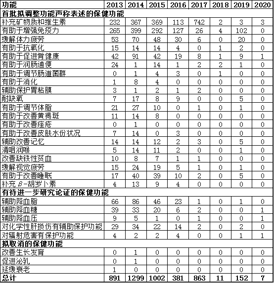数据来源:原国家市场监督管理总局网站公布的保健食品信息数据库统计分析方法: Excel+SPSS 17.0 统计软件2019 年 4月,国家市场监管总局发布《关于征求调整保健食品保健功能意见》的公告,将对保健食品的部分保健功能声称表述进行调整或取消,对一些保健功能进一步研究论证。首批拟调整功能声称表述的保健功能包括免疫调节、抗疲劳、改善骨质疏松、改善胃肠功能、减肥、美容等。拟取消的保健功能包括改善皮肤油分、促进生长发育、促进泌乳、抑制肿瘤、预防青少年近视等。有待进一步研究论证的保健功能包括辅助降血脂、降血糖、降血压、促进排铅等。本文对2013~2020 年已注册备案保健食品的功能进行汇总,列于表 1 中。