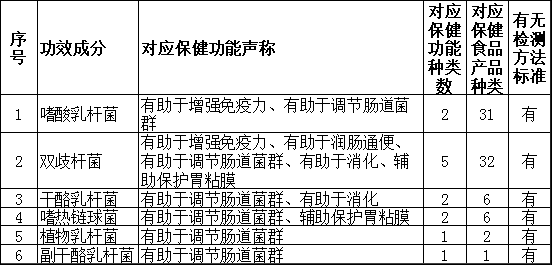 对6种益生菌类功效成分对应的功能声称、保健食品产品数量、检测方法标准情况进行了汇总,列于表6中。表 6 益生菌类功效成分功能声称、产品、检测方法标准情况