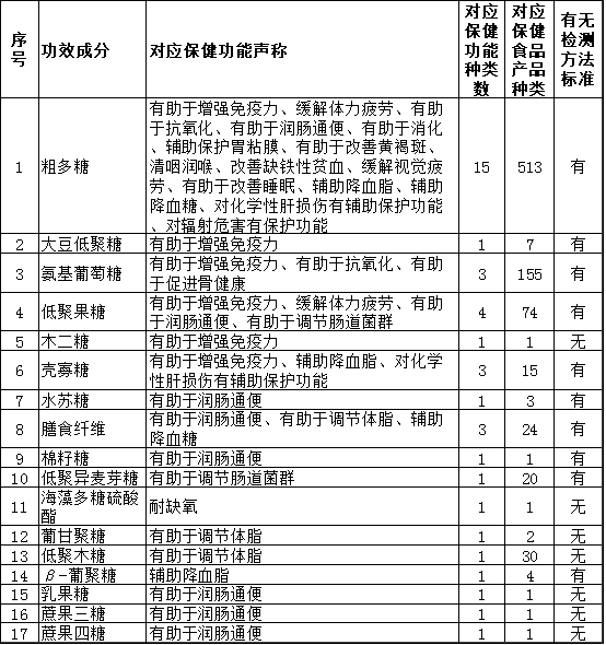 从表3中可以看出,只有γ-亚麻酸、共轭亚油酸、油酸三种功效成分有明确的功能声称,而大多数功效成分具有较多的功能声称,比如亚油酸、α-亚麻酸、磷脂、10-羟基-α-癸烯酸等功效成分都有5种以上的功能声称,这些功能声称跨度也较大。而且这些功效成分对应的保健食品产品数量也较多,过多的功能声称也存在夸大宣传的情况,对于产品和原料本身也具有负面影响。目前了解到DHA原料只备案了辅助改善记忆的功能声称,今后涉及其他功能声称的DHA类保健食品产品将无法进行备案,所以脂肪酸类相应原料的功能声称也需要进行斟酌和确认。同时从表3中可以看出,目前除γ-亚麻酸缺乏检测方法标准外,其他产品数量较多的功效成分都有相应的检测方法标准。本文对17种糖类功效成分对应的功能声称、保健食品产品数量、检测方法标准情况进行了汇总,列于表4中。表 4 糖类功效成分对应的功能声称、产品、检测方法标准情况