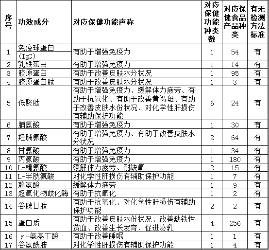 从表4中可以看出,其中粗多糖作为一个复杂成分拥有最多的功能声称和产品数量,而一些小分子的氨基葡萄糖、低聚果糖、低聚木糖、低聚异麦芽糖等也具有较广泛的产品基础。同时表中也反映出,除低聚木糖外,产品数量较多糖类功效成分基本都配有相应的检测方法标准,只有一些比较小众的糖类功效成分缺乏相应的检测方法标准,有待进一步评估后进行标准研制,同时应加快低聚木糖检测方法标准的研制工作,促进相应的产品的正常发展。本文对17种蛋白、多肽及氨基酸类功效成分对应的功能声称、保健食品产品数量、检测方法标准情况进行了汇总,列于表5中。从表5中可以看出除低聚肽、蛋白质外,大部分蛋白、多肽及氨基酸类功效成分都具有明确的功能声称。其中又以免疫球蛋白(IgG)、胶原蛋白和几种氨基酸较受市场欢迎,具有较多的产品种类。这一分类中各功效成分都有完备的检测方法标准。表 5 蛋白、多肽及氨基酸类功效成分功能声称、产品、检测方法标准情况
