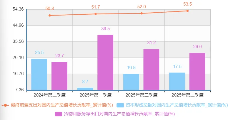消费:绝对值看,2025年消费对中国GDP贡献最大,连续四个季度都在50%以上。