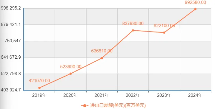 其一,出口赚到的巨额顺差太多都润出去了。2019年至2025年中国累计贸易顺差总额超5万亿美元,