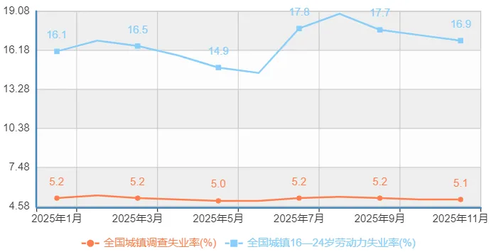 如下,统计局的年轻人就业率数据,全国整体失业率在5%左右,但年轻人的统计失业率在17%左右。