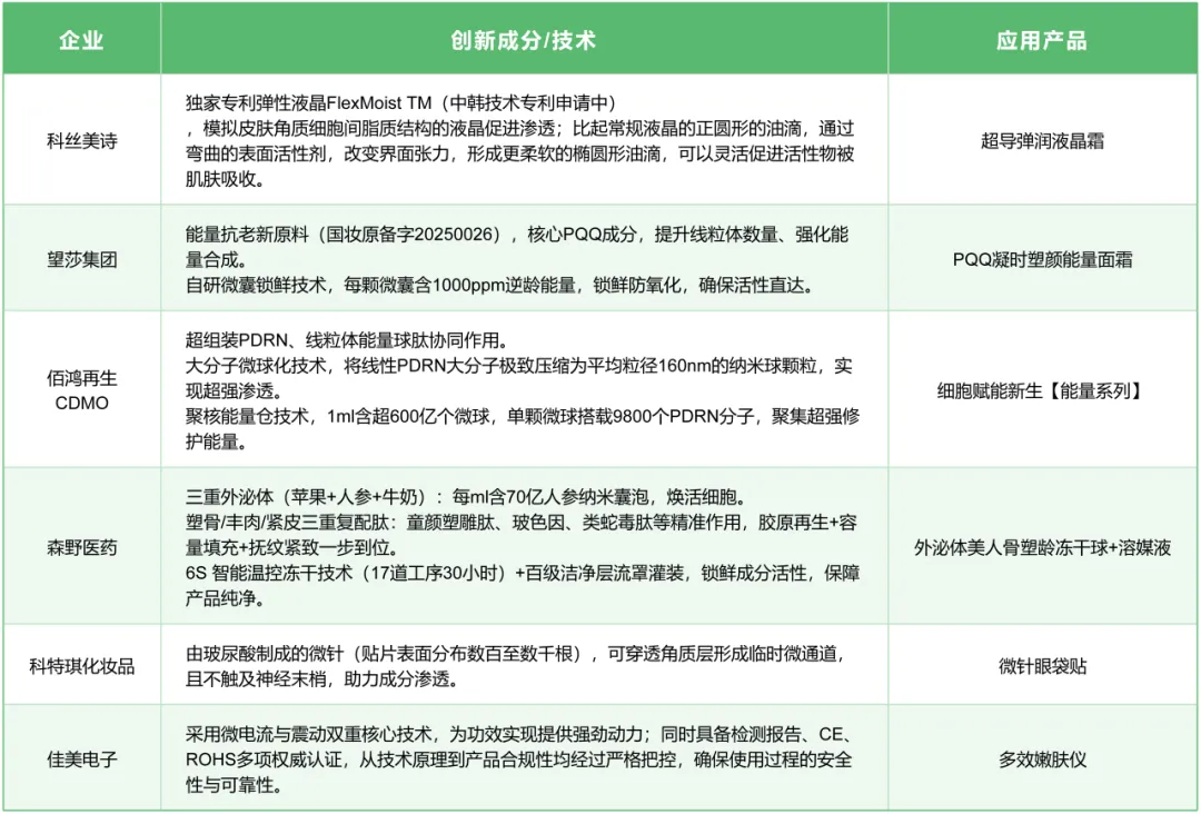 信息显示,望莎集团应用于PQQ凝时塑颜能量面霜的核心成分PQQ,可提升线粒体数量,强化能量合成,自研微囊锁鲜技术可锁鲜防氧化,确保活性直达;佰鸿再生的超组装PDRN、线粒体能量球肽,可发挥焕活+修损双重作用,大分子微球化技术则旨在增强渗透;森野医药的“三重外泌体”(苹果+人参+牛奶)能够焕活细胞,6S智能温控冻干技术则可锁鲜植物活性;科丝美诗独家专利弹性液晶FlexMoist TM的主要作用,同样是促进活性物被肌肤吸收。