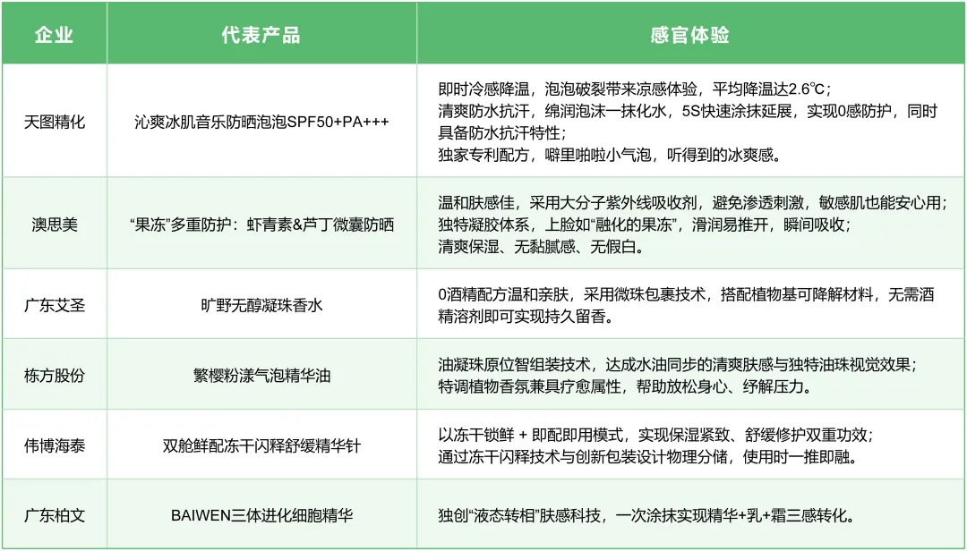 以天图精化最新开发的“沁爽冰肌音乐防晒泡泡SPF50+PA+++”为例,在户外高温环境下,除可长效防晒外,还能通过小气泡破裂带来凉感体验,破裂的声音也能够减压,增强趣味性;澳思美的“‘果冻’多重防护:虾青素&芦丁微囊防晒”,采用了独特凝胶体系,上脸如“融化的果冻”,滑润易推开,且清爽保湿;栋方股份的“繁樱粉漾气泡精华油”,以油凝珠原位智组装技术清爽肤感与独特油珠视觉效果,同时特调植物香氛,帮助放松身心、纾解压力。