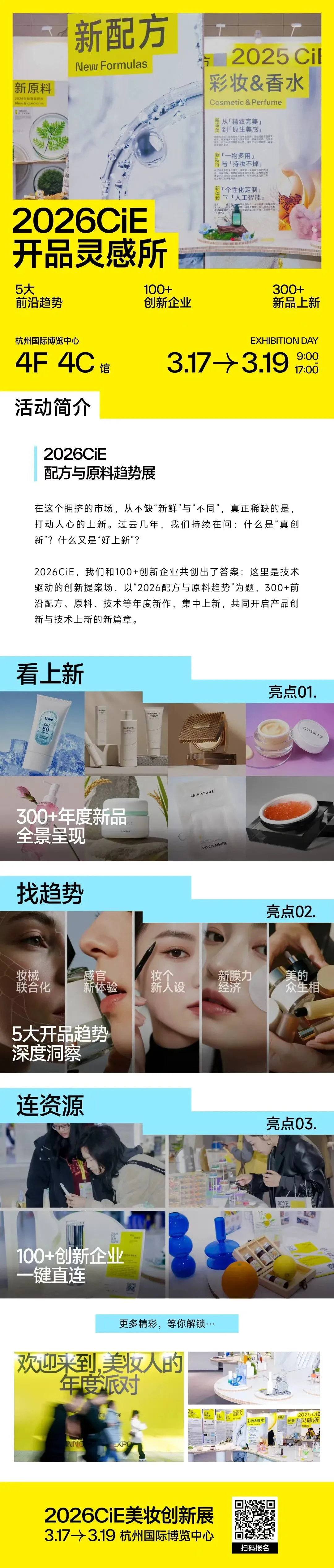 300+包材与设计机构展商,200+OEM/ODM与创新原料展商将悉数亮相,4楼4C馆「CiE开品灵感所」将独家上新300+优质配方与创新原料,独家首发「妆械联合化+感官新体验+妆个新人设+新膜力经济+美的众生相」2026年5大开品新趋势。