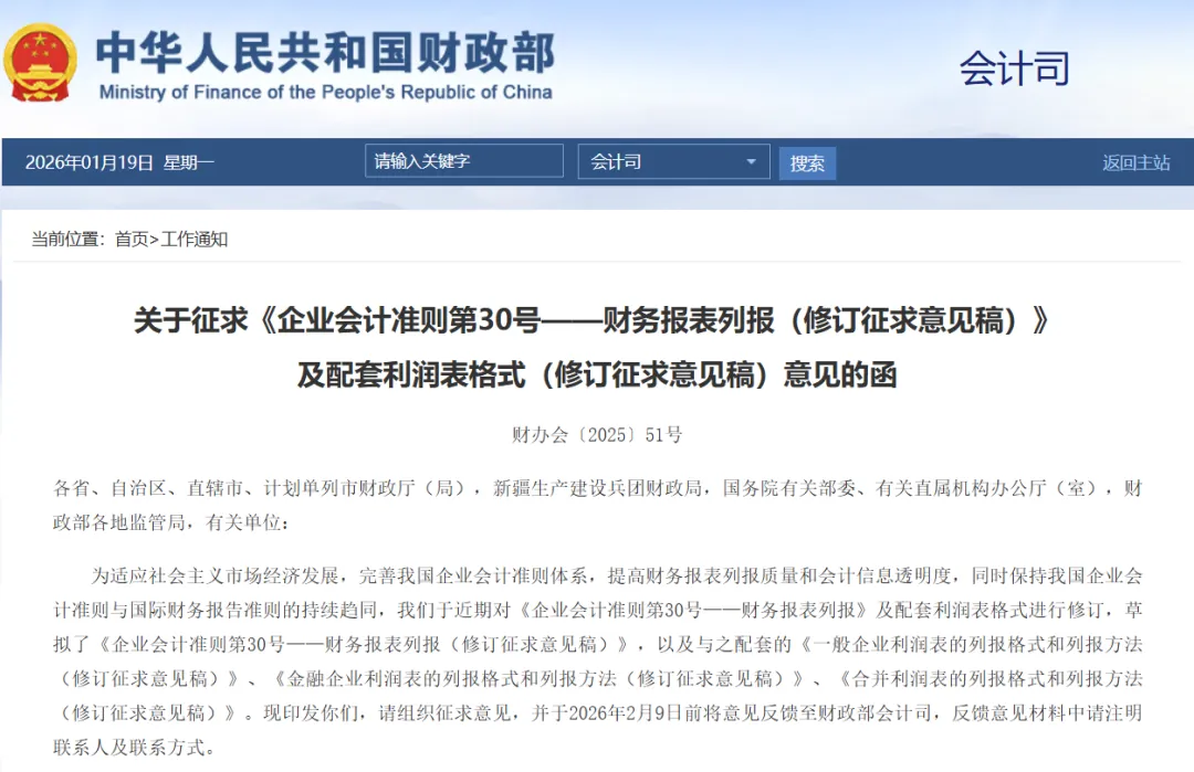 财政部在2025年12月31日发布了财办会〔2025〕51号关于征求《企业会计准则第30号——财务报表列报(修订征求意见稿)》及配套利润表格式(修订征求意见稿)意见的函。