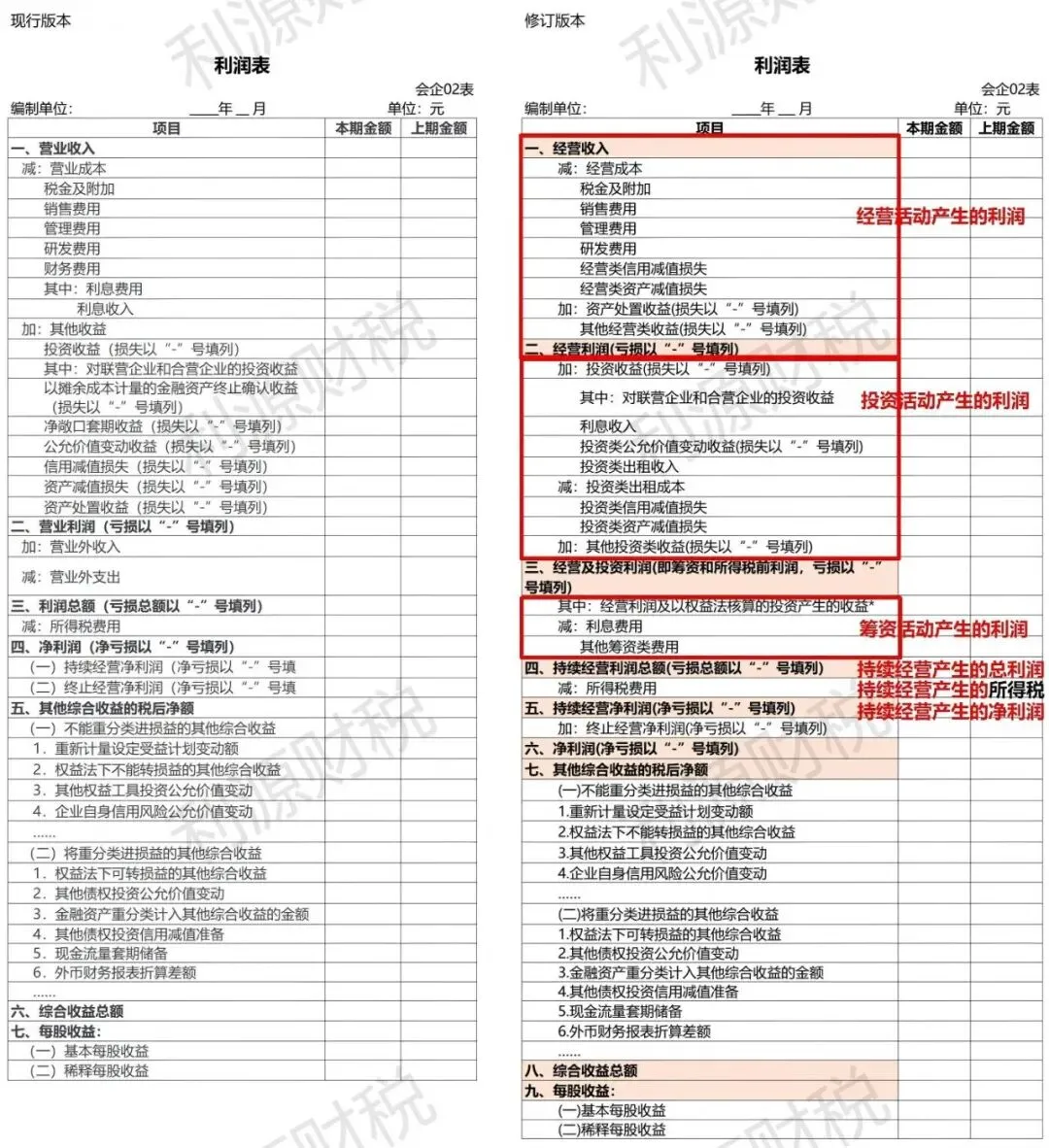 将企业利润表中的当期损益,划分为经营、投资、筹资、所得税费用、终止经营5大口径,以优化利润表结构,便于使用者识别企业利润来源,提升财务业绩信息的有用性。同时,新增两个合计项目,分别是“经营利润”和“经营及投资利润(筹资和所得税前利润)”。