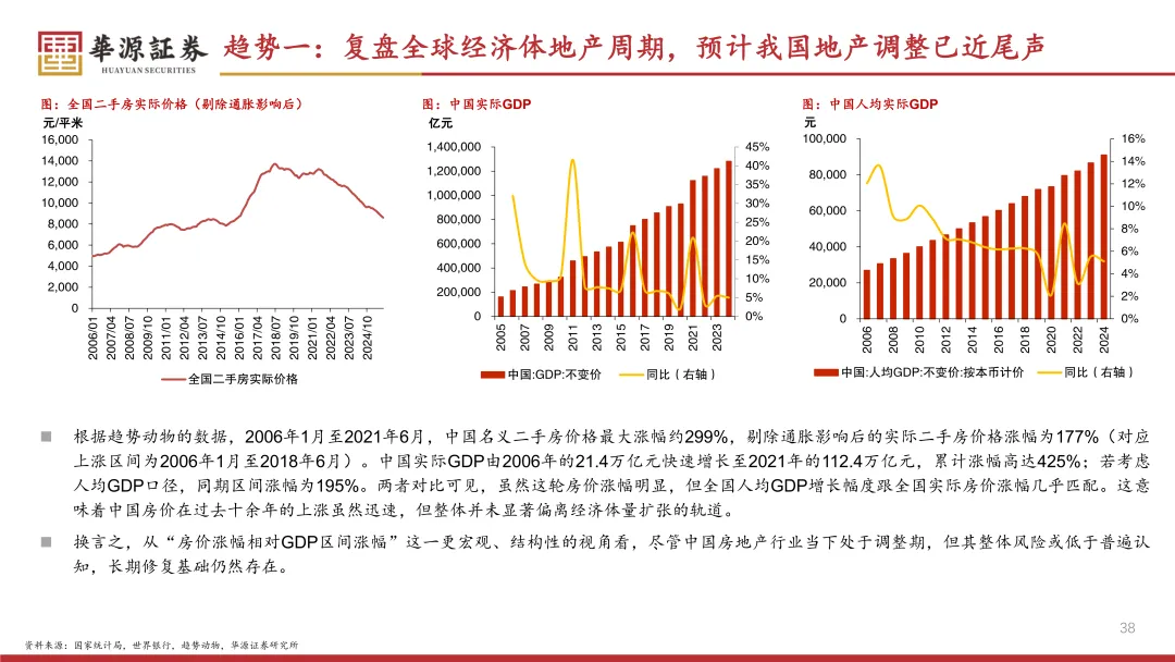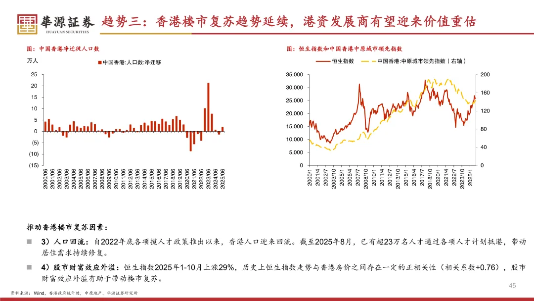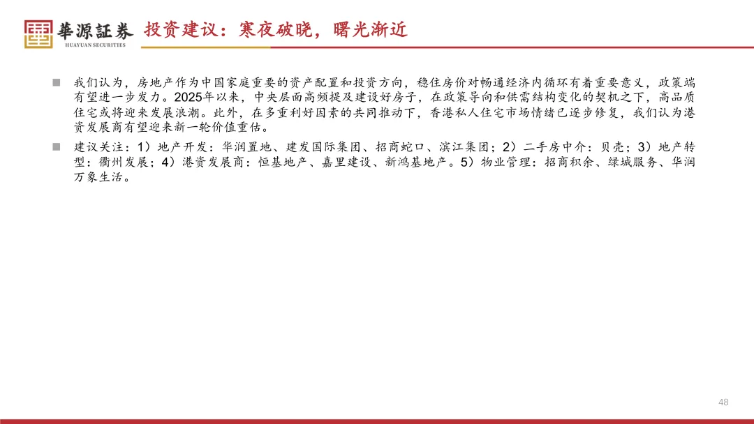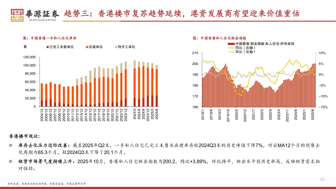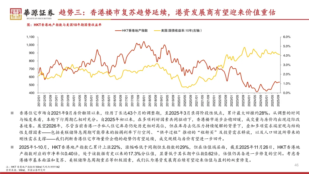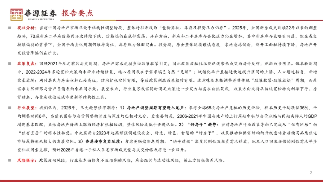 行业展望:我们认为,2026年,三大趋势值得期待:1)房地产调整周期有望进入尾声:参考全球68次房地产危机的历史经验,样本历史平均跌幅35%,平均调整时间6年,当前我国实际房价调整的长度与深度均已相对充分。更重要的是,2006-2021年中国房地产的上行周期中实际房价涨幅与同期实际人均GDP 增速基本匹配,显示房地产价格上涨与经济扩张相协调,整体风险或低于普遍认知。2)“好房子”趋势:当前房地产行业政策导向已完成从“住有所居”向“住有宜居”的根本性转变。中央层面自2023年起高频强调建设安全、舒适、绿色、智慧的“好房子”,政策推动和供需结构的升级意味着后续高品质住宅市场或将迎来较大的发展空间。3)香港楼市复苏延续:考虑美联储降息周期、“供平过租”激发的刚性及投资需求释放,以及人口回流提供的刚性需求等多重积极因素支撑,预计2026年香港一手私人住宅市场成交量与成交价格或将进一步回升。