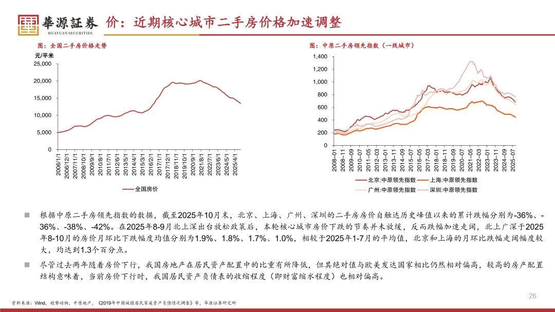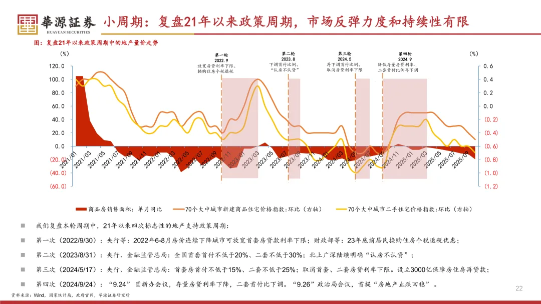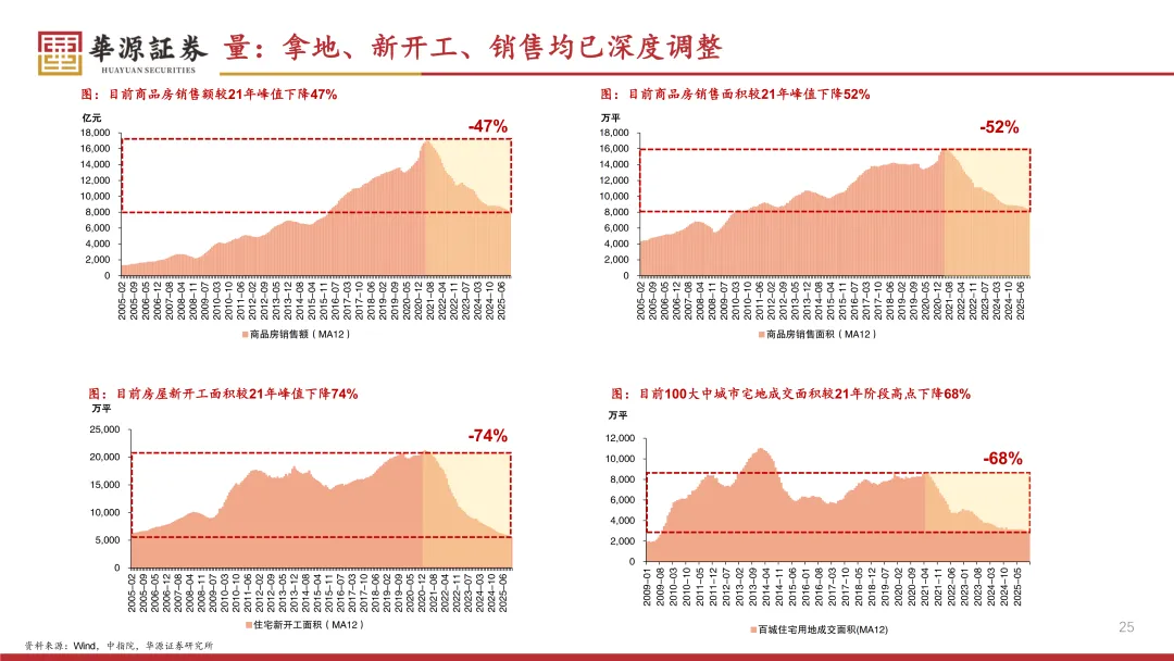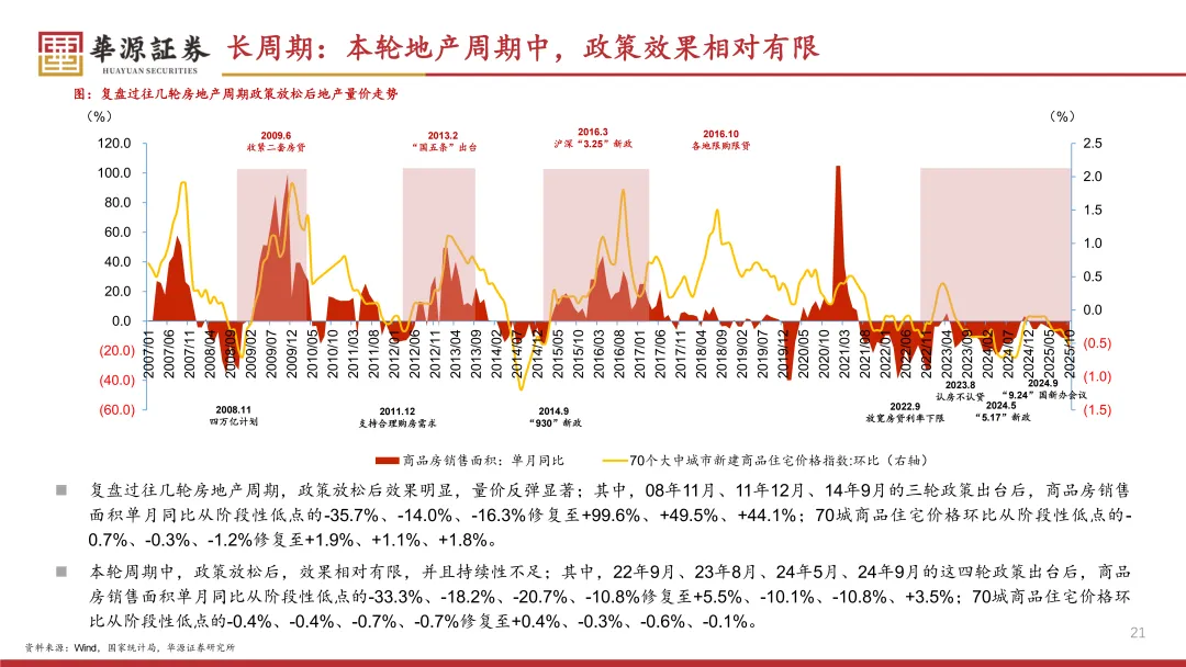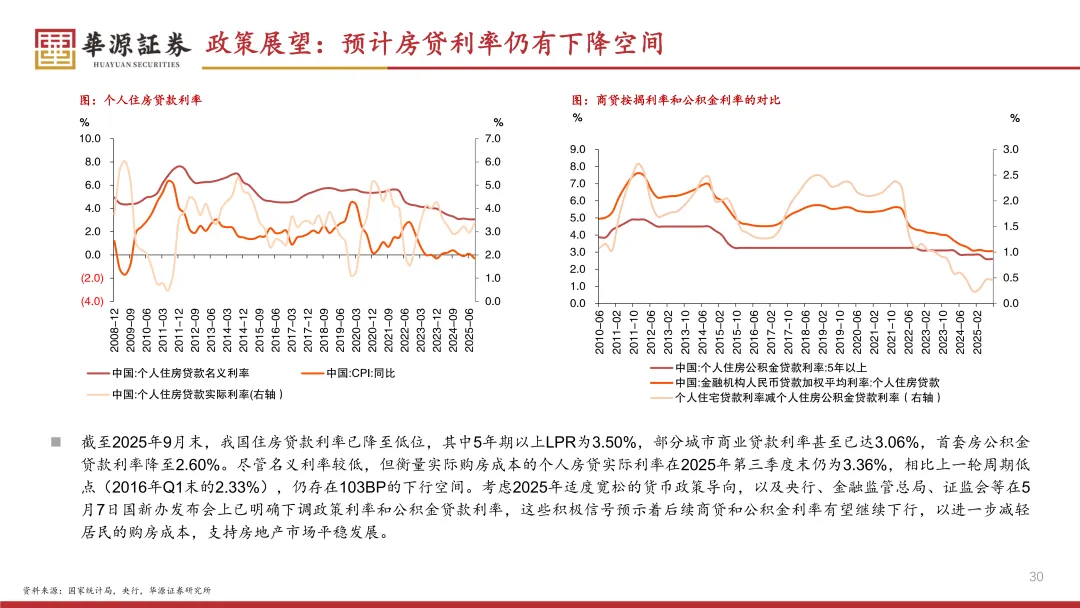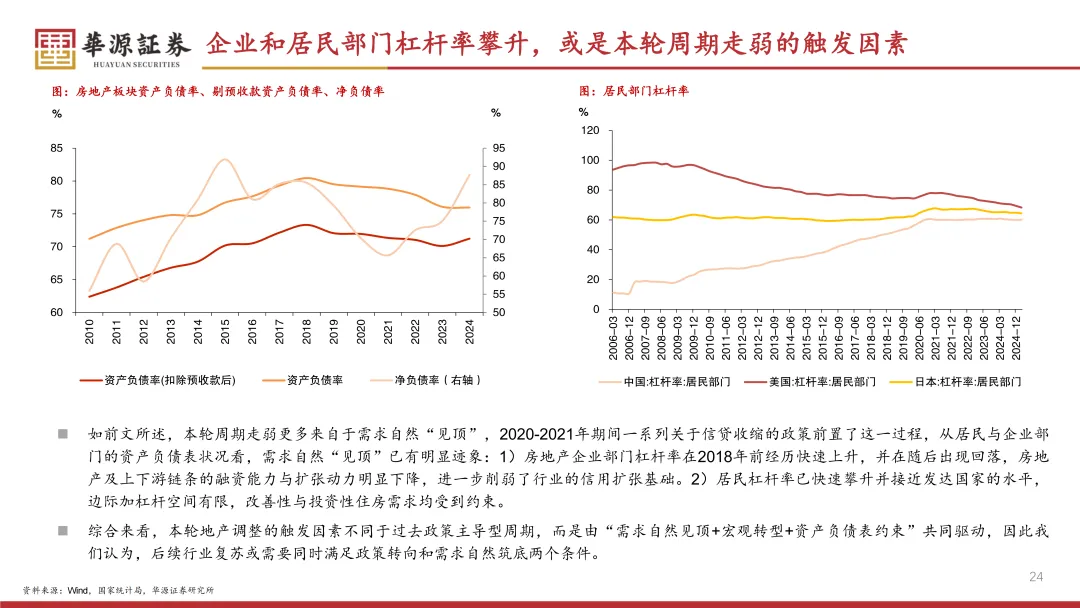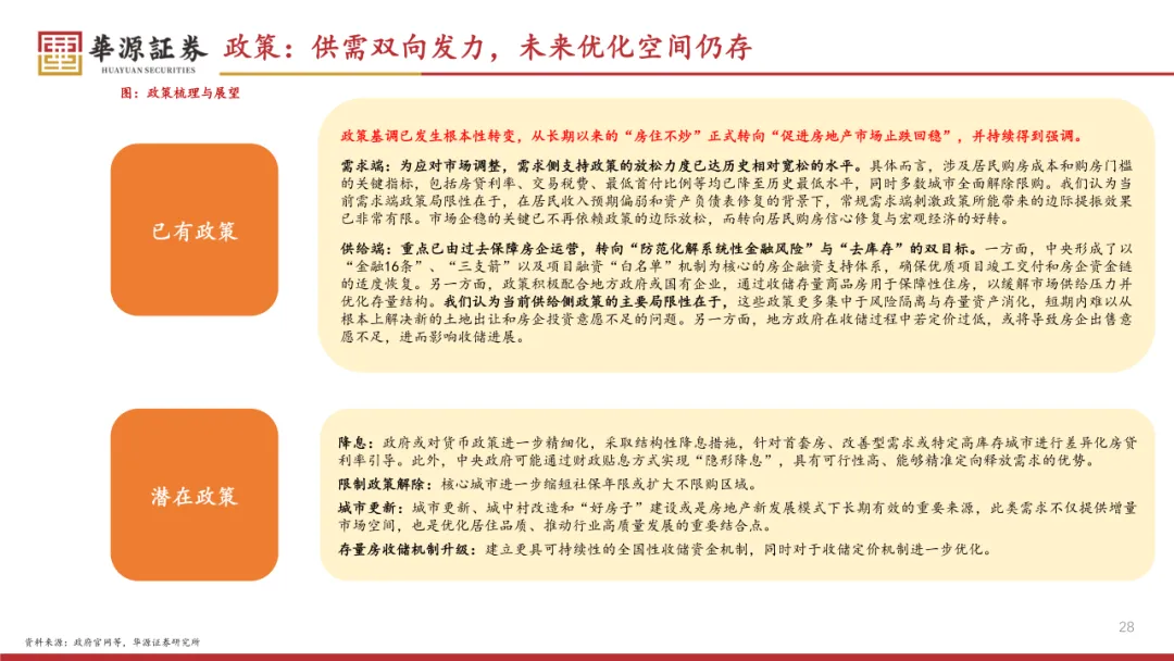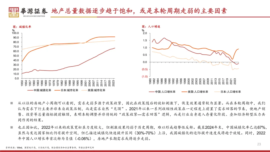政策复盘:回顾2021年及之前的历史周期,房地产需求走弱多由政策收紧引发,因此政策放松往往能迅速带来成交与房价反弹,刺激效果明显。但本轮周期中,2022-2024年多轮宽松政策均未带来持续修复,核心原因或在于需求端已自然“见顶”:城镇化率升至接近快速提升区间的上沿、人口增速转负,新增需求放缓;同时居民与房企杠杆已处高位,信用扩张空间有限,导致政策刺激效果相对有限。这意味着本轮调整并非传统“政策收紧-政策放松”周期,而是需求自然回落与资产负债表约束共同导致。展望未来,行业复苏或需同时满足政策进一步发力与需求自然筑底,政策方向或将从传统宽松转向利率下行、房贷贴息、存量房收储及城市更新等结构性工具。