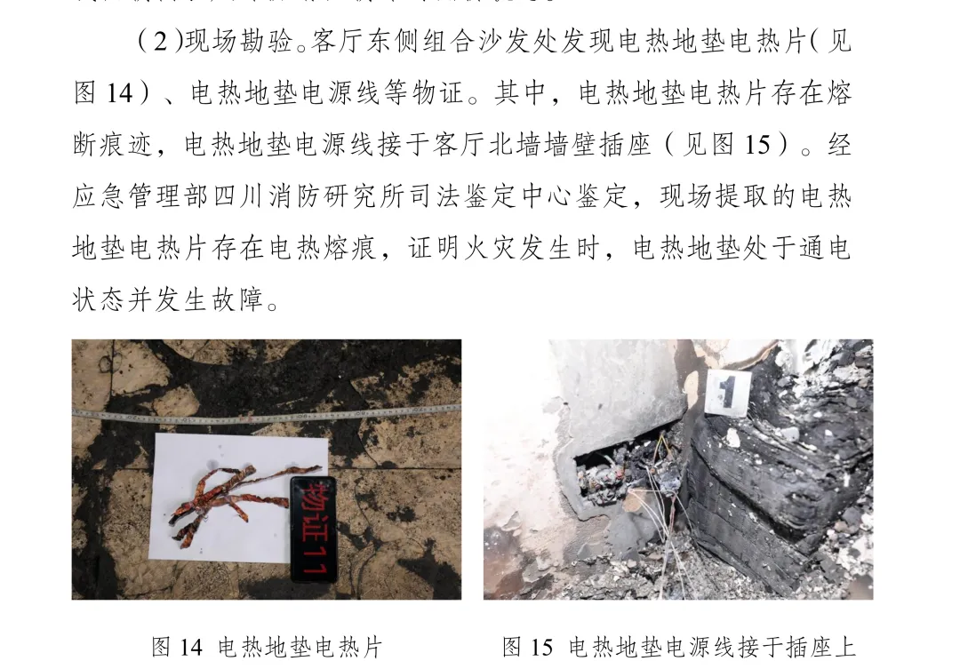 物证鉴定确定电热地垫起火前处于通电状态并发生电气故障