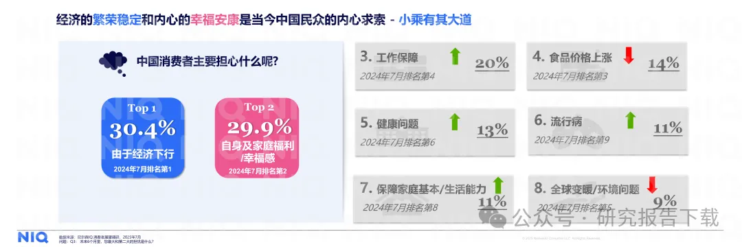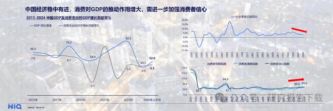 中国经济稳中有进,消费对 GDP 的推动作用持续增大,多轮国补与国债支持政策有效拉动内需。消费者对个人财务状况感知整体乐观,但仍有四成支出相对谨慎,经济下行与自身及家庭福利是主要担忧。