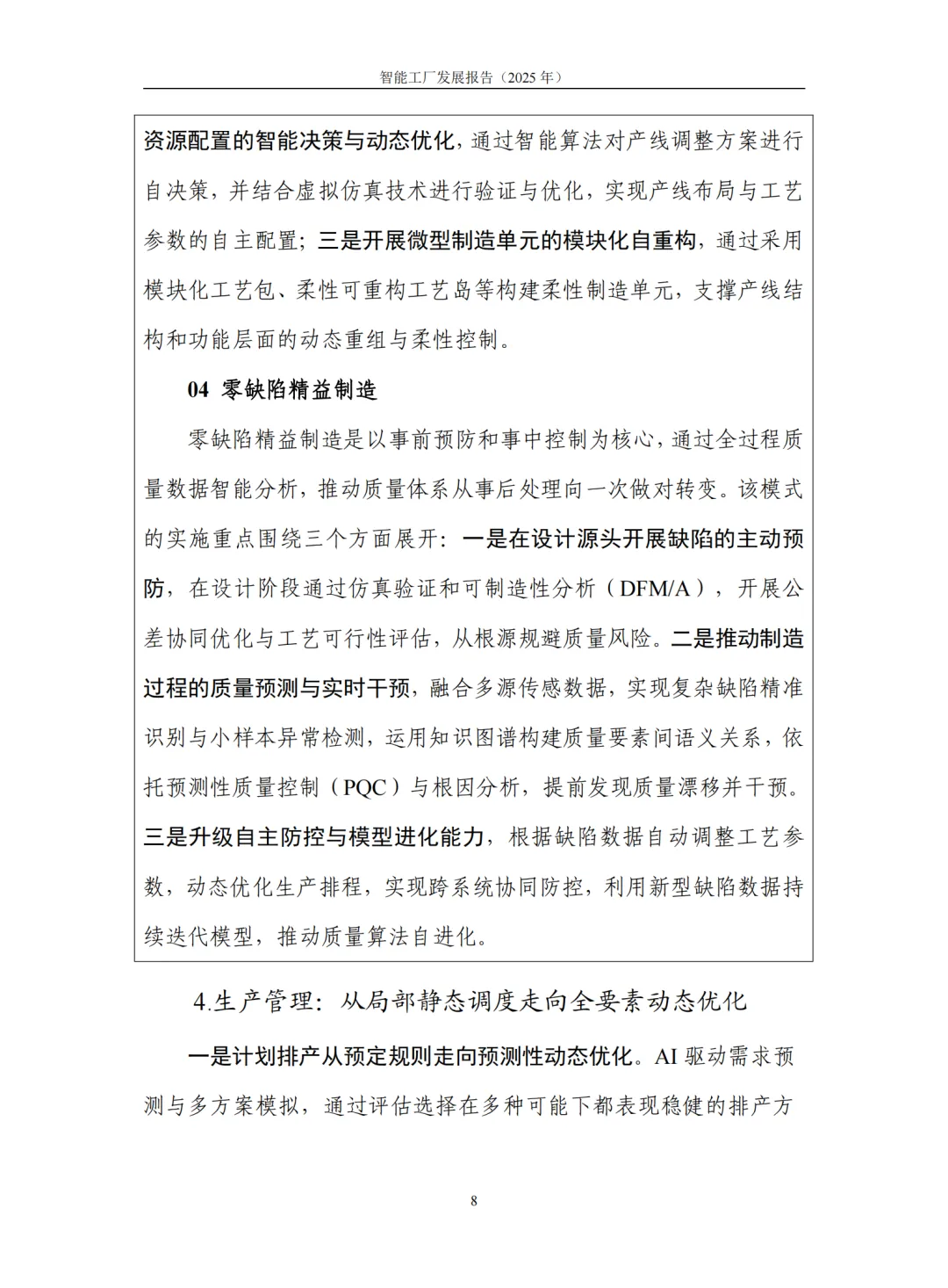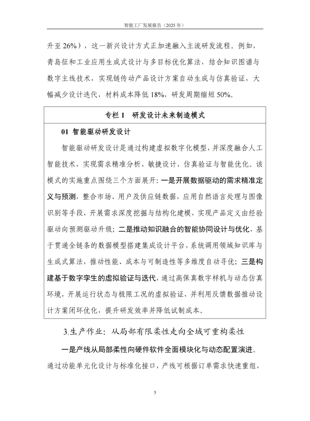 2. 演进方向明确,呈现五大核心变革。其一,建设内涵实现跨越,从单纯的物理实体建设,朝着融合数据模型与机理模型的 “虚实融合” 孪生工厂演进,工厂具备了分析、预测与优化能力;其二,研发设计范式革新,从依赖经验的传统模式,转向 “数据 + 模型” 双驱动的新范式,大幅缩短研发周期并提升产品质量;其三,生产作业能力升级,从单元级的局部柔性,升级为大范围、可快速重构的全域柔性制造系统,实现生产过程的精准感知与精确控制;其四,生产管理模式优化,从基于规则的静态调度,转变为全要素(人、机、料、法、环)资源动态配置与全局优化,追求系统整体效能最大化;其五,运营管理智能进阶,从数据辅助决策,升级为具备自感知、自学习、自决策、自执行、自适应能力的智能决策模式,有效驱动商业模式创新。