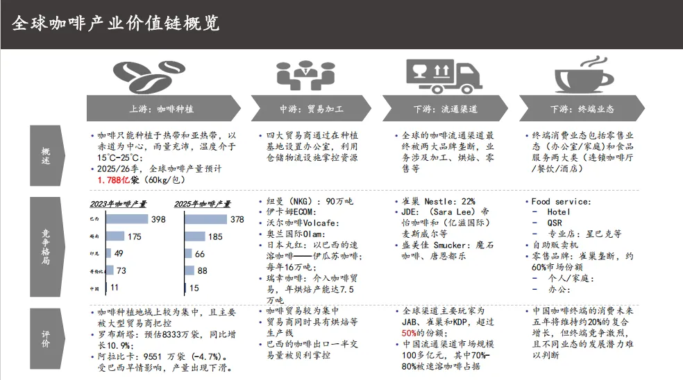 上游种植端,云南咖啡占全国产量 98% 以上,精品豆占比提升至 30%,出口额因品质升级持续增长;进口端量价齐升,2025 年进口额同比增长 432%,巴西、哥伦比亚、越南为主要进口来源地。全球供应链波动加剧,ICE 咖啡期货创 47 年新高,倒逼品牌通过长协采购、自建工厂稳定成本。