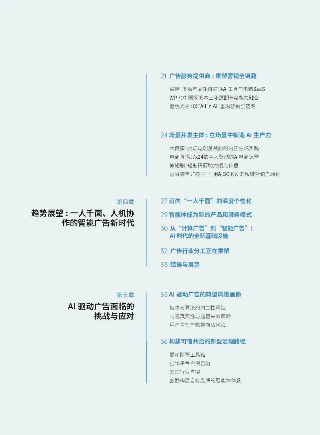 全球头部广告平台正率先完成 AI 转型,打造覆盖创意生成、投放执行、安全治理的完整技术体系。谷歌以多模态大模型 Gemini 为核心,系统性重构广告生态,Product Studio 工具支持基于产品描述自动生成整套广告方案,AI Mode 功能将广告有机嵌入对话答案,2024 年通过 AI 模型自动处理 97% 的违规页面,构建起主动防御体系。Meta 基于 Llama4 大模型构建广告新范式,Advantage + 智能广告平台实现全流程自动化与个性化升级,用户点击率提升 15%,互动时长增加 20%,同时通过元宇宙布局与智能硬件,拓展沉浸式广告体验。