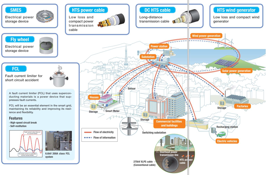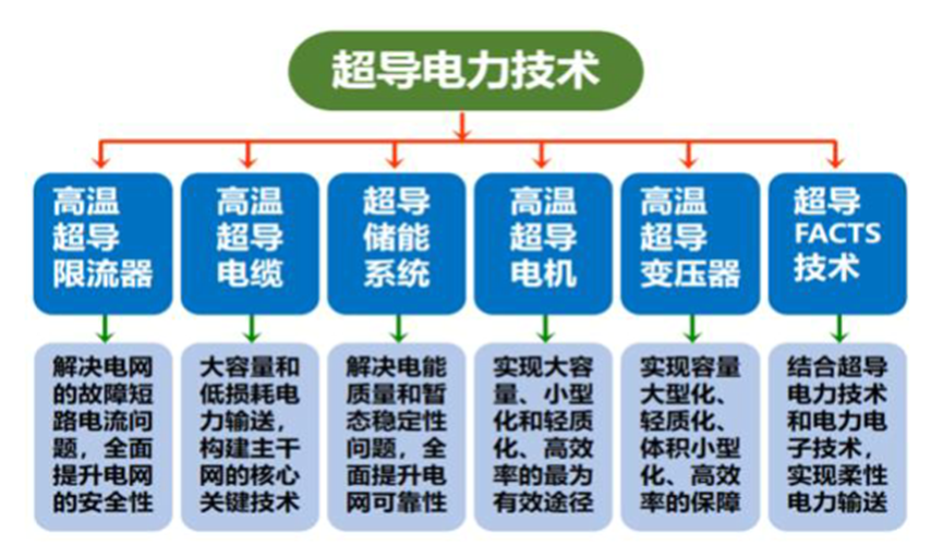 高温超导技术在电力工业具有广阔的应用前景和巨大的市场潜力。超导电力的结合包括高温超导限流器、高温超导电缆、高温超导变压器等一系列产品,且均已在实际生活中得到使用,其中高温超导输电电缆在超导体实现规模化的商业应用过程中,率先迈向产业化,目前已有多个长距离高温超导电缆挂网运行。