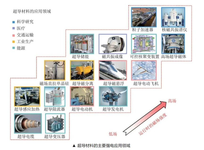 ✓ 超导材料具有常规材料不具备的零电阻、完全抗磁性等宏观量子现象,是典型的量子材料。超导体因为具有绝对的零电阻和完全的抗磁性两大特性,在所有涉及电和磁的领域都有超导体的用武之地,应用领域广泛,包括电子学、生物医学、科学工程、交通运输、电力等领域。
