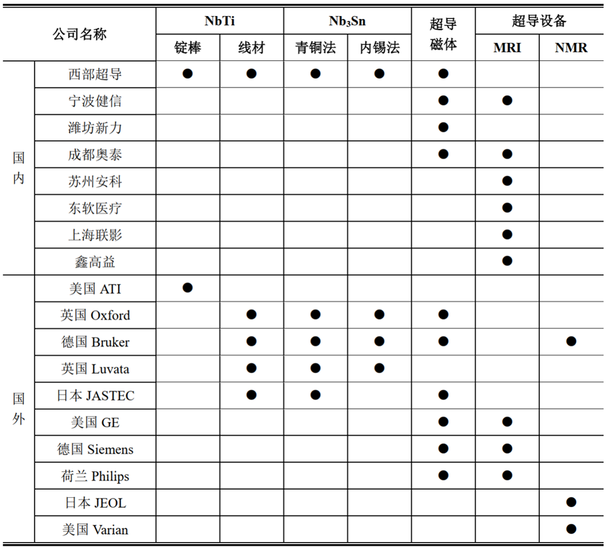 ✓ 低温超导应用场景拓展。NbTi超导线材用量占整个超导材料市场的90%以上。目前已实现商业化的包括 NbTi(铌钛,Tc=9.5K)和 Nb3Sn(铌三锡,Tc=18k),NbTi 超导线材由于具有优异的中低磁场超导性能、良好的机械性能和加工性能、价格优势,其用量占整个超导材料市场的90%以上。