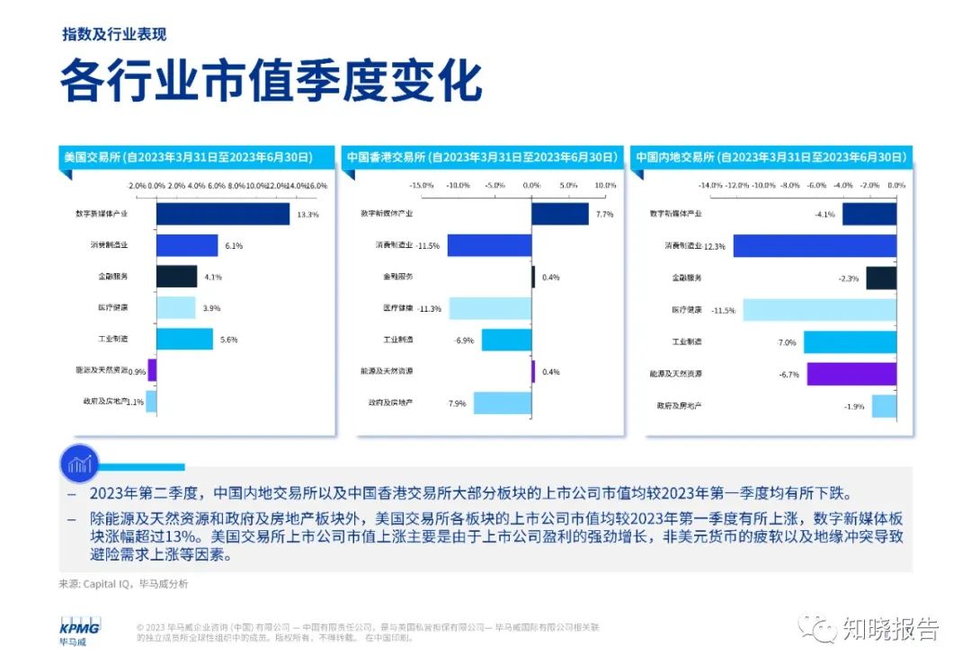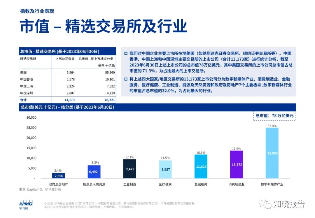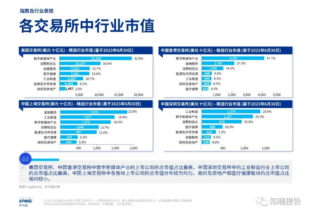 我们对美国、中国香港、中国上海和中国深圳的主要交易所的上市公司的市值变化情况及市场表现进行了统计分析,我们将上述四大国家/地区交易所的13,173家上市公司分为数字新媒体产业、消费制造业、金融服务、医疗健康、工业制造、能源及天然资源和政府及房地产7个主要板块