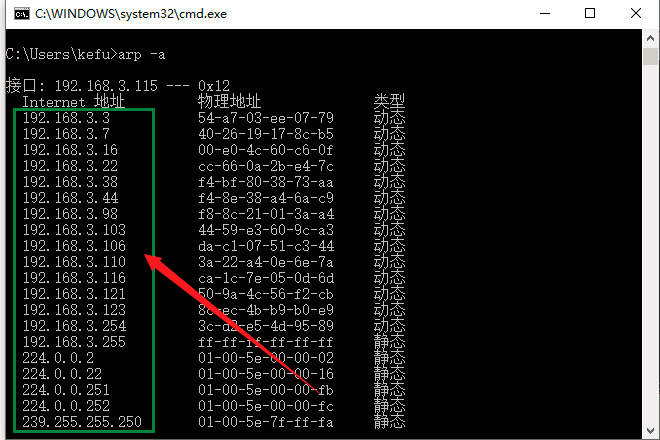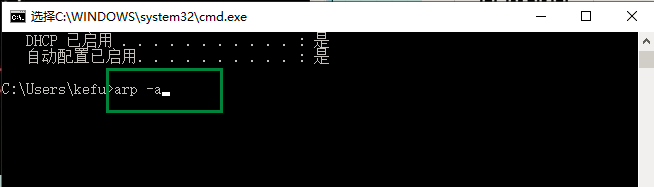 然后在命令提示窗口输入arp -a,进行回车,等待返回结果。