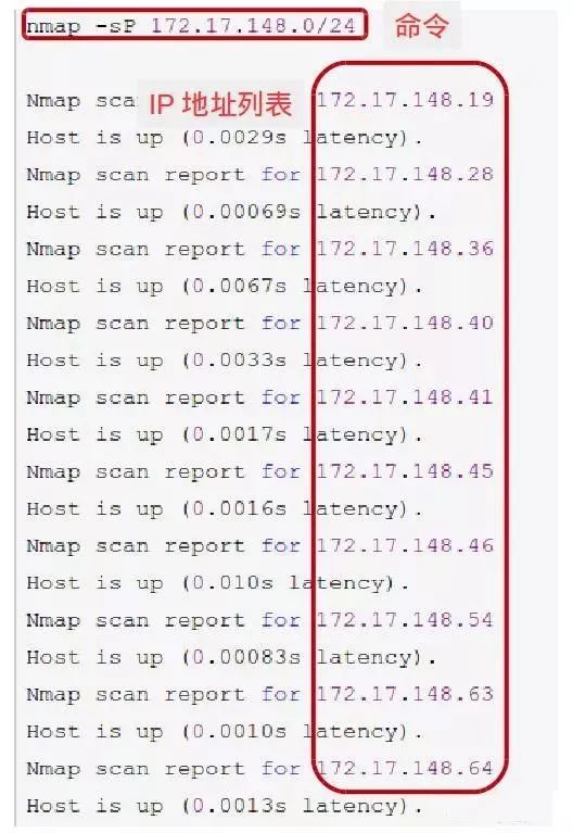 相关命令“nmap -sP 172.17.148.0/24",操作命令和扫描结果如下图所示。