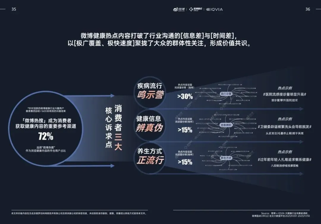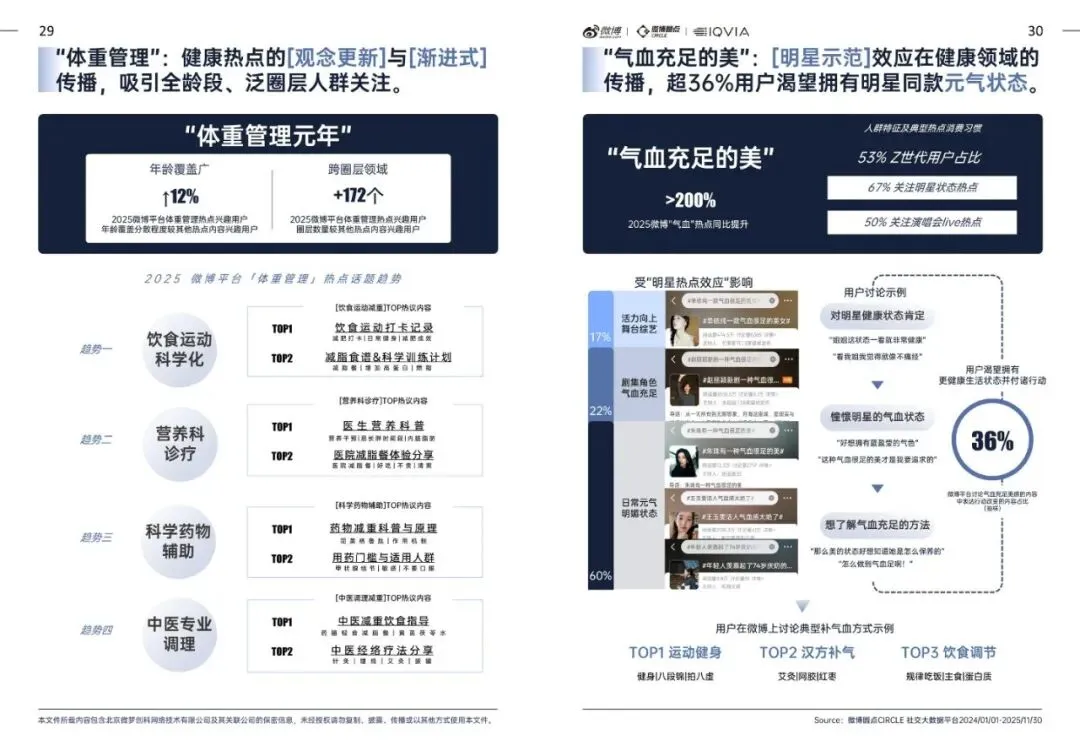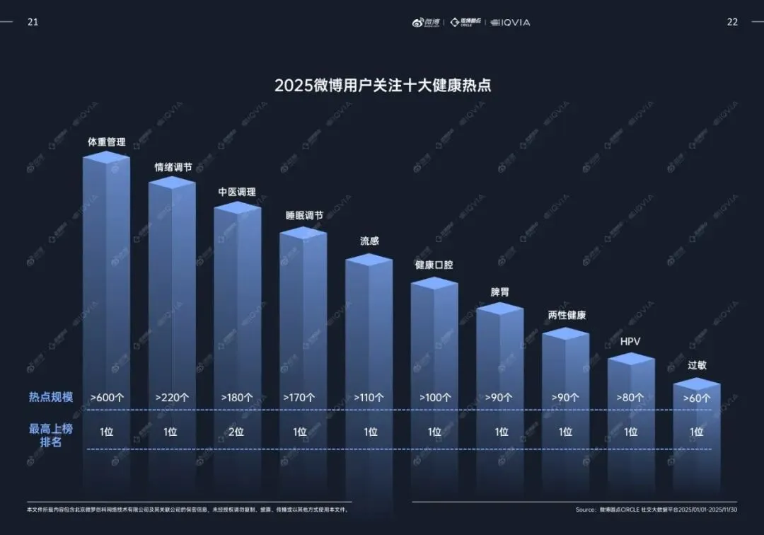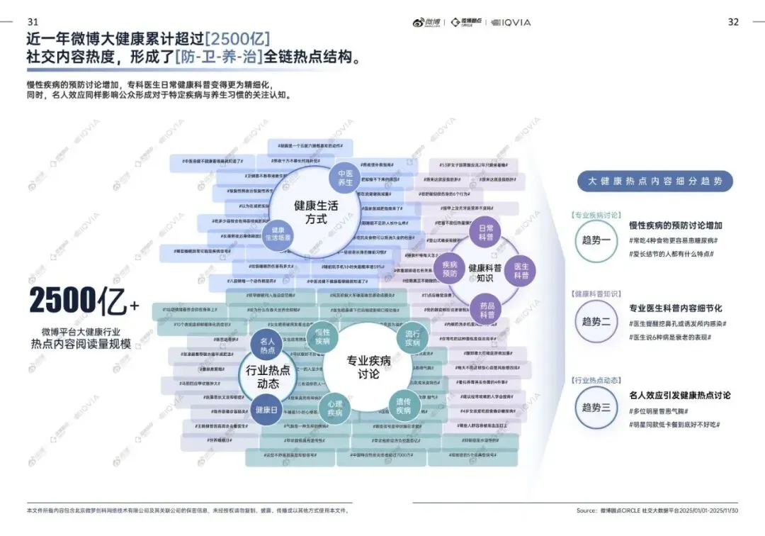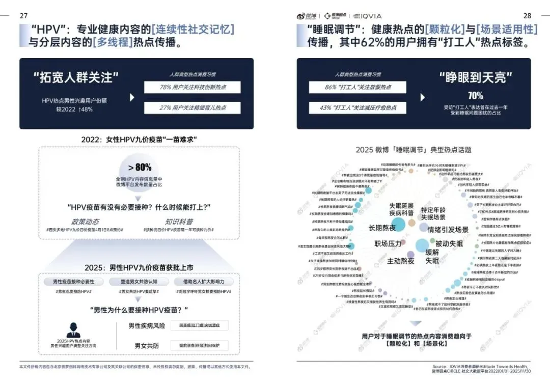 微博等社媒平台构建了庞大的大健康内容生态,2025 年累计产生超 2500 亿社交内容热度,形成 “防 - 卫 - 养 - 治” 全链路热点结构。健康热点已从垂直领域走向全民化、从专业话题转向生活场景化,体重管理、情绪调节、中医调理、睡眠调节等成为用户最关注的十大热点。不同热点呈现独特传播规律:流感等流行疾病具有突发性,过敏话题呈现季节性,HPV 相关内容形成连续性社交记忆,睡眠调节和体重管理则聚焦颗粒化场景与观念更新,吸引全龄段、泛圈层用户参与讨论。
