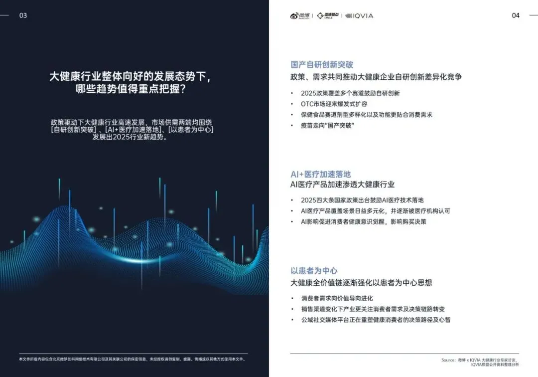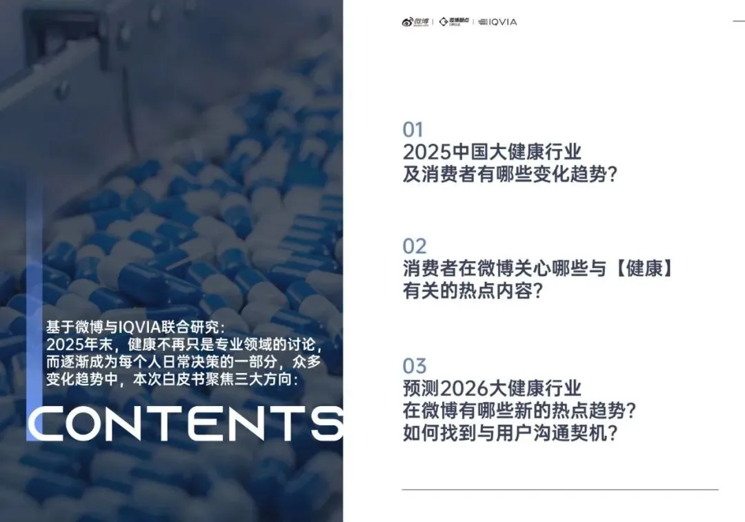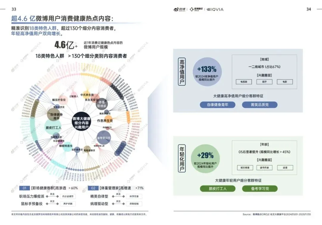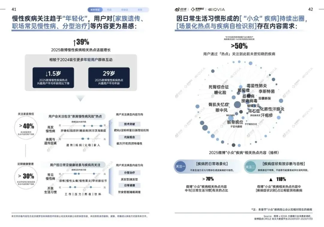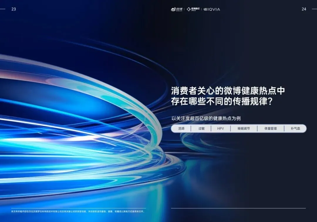 微博等社媒平台构建了庞大的大健康内容生态,2025 年累计产生超 2500 亿社交内容热度,形成 “防 - 卫 - 养 - 治” 全链路热点结构。健康热点已从垂直领域走向全民化、从专业话题转向生活场景化,体重管理、情绪调节、中医调理、睡眠调节等成为用户最关注的十大热点。不同热点呈现独特传播规律:流感等流行疾病具有突发性,过敏话题呈现季节性,HPV 相关内容形成连续性社交记忆,睡眠调节和体重管理则聚焦颗粒化场景与观念更新,吸引全龄段、泛圈层用户参与讨论。