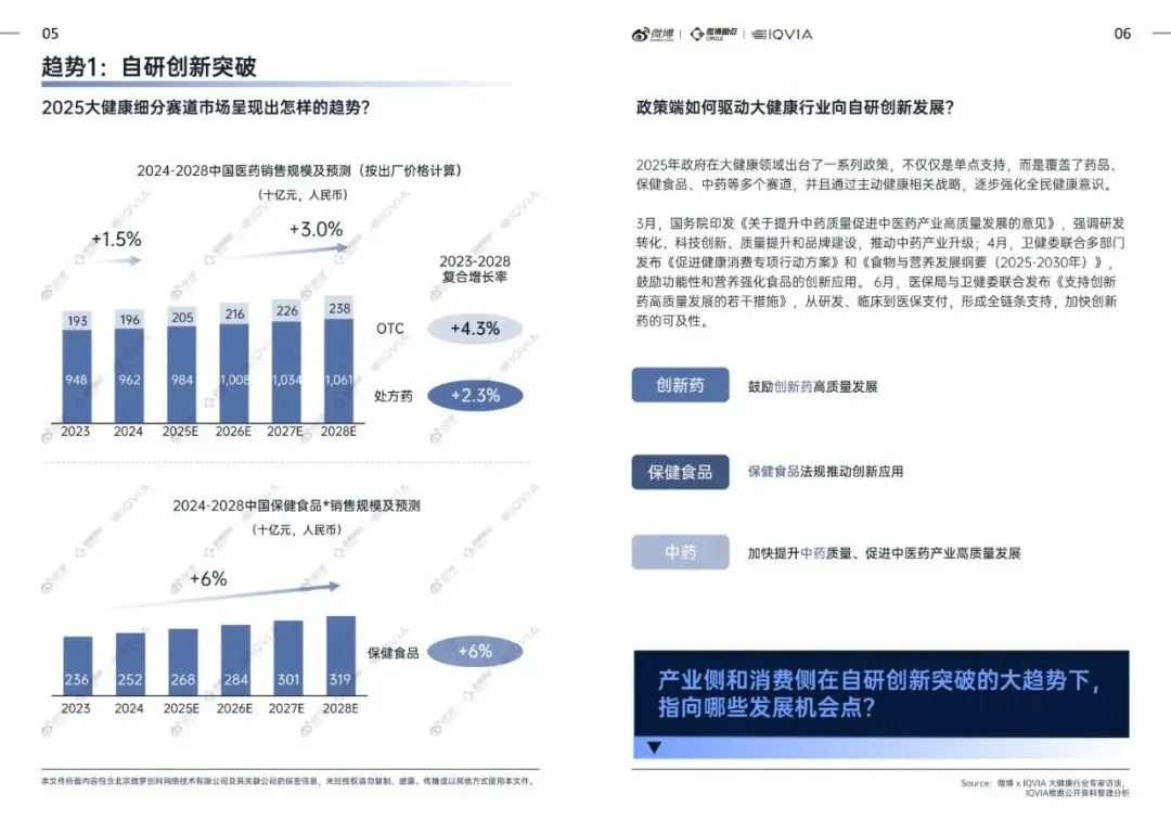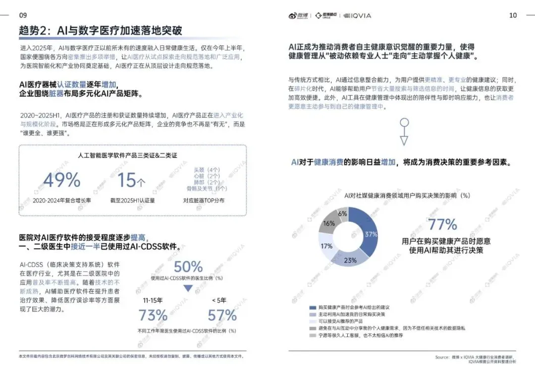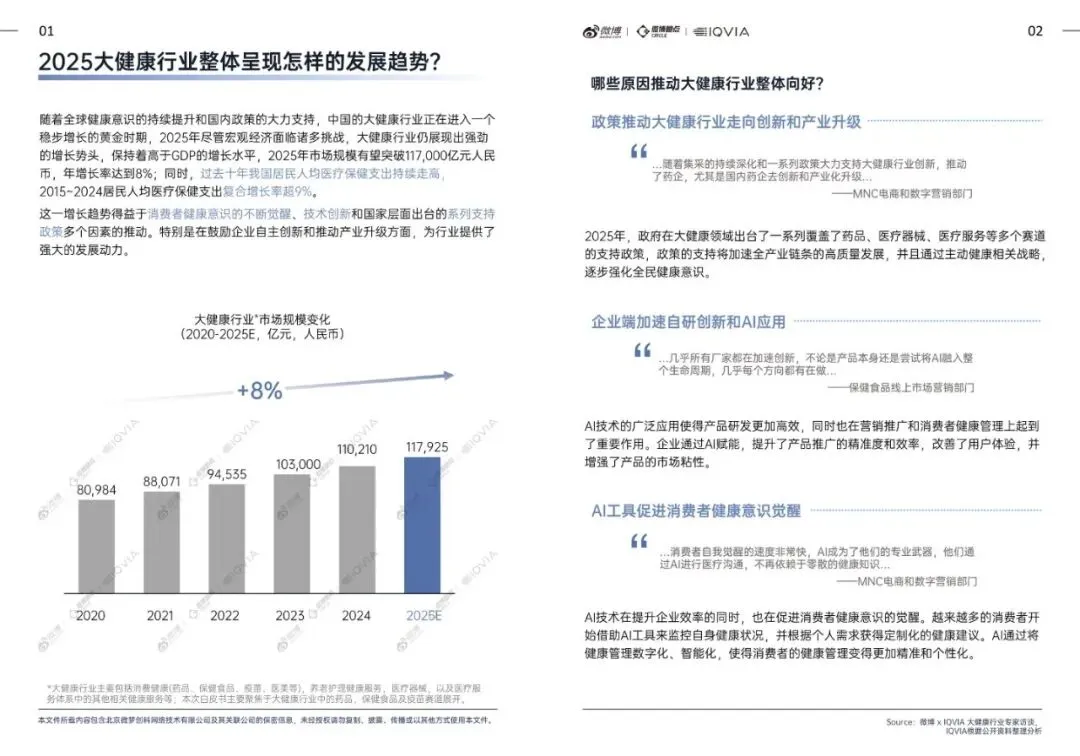 2025 年中国大健康行业持续回暖,市场规模有望突破 11.7 万亿元,年增长率达 8%,增速高于 GDP 水平。行业增长受政策、技术与消费需求共同驱动:政策层面密集出台支持创新药、中医药产业升级、保健食品创新应用的举措;技术端 AI 与数字医疗加速落地,AI 医疗器械认证数量逐年增加,医院对 AI 辅助软件的接受度不断提高;消费端健康意识全面觉醒,从被动治疗转向主动健康管理,推动行业向自研创新突破、AI + 医疗融合、以患者为中心三大方向转型。