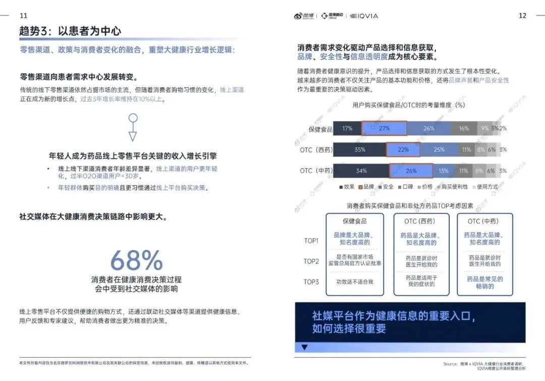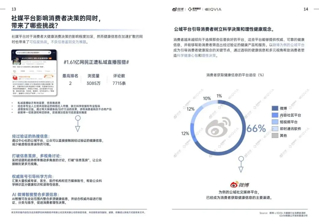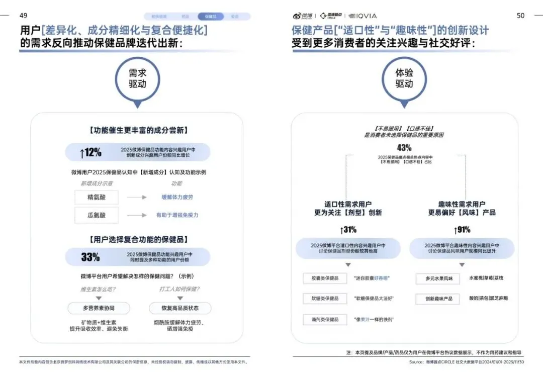 消费者健康需求愈发细分差异化,决策逻辑与信息获取方式发生深刻变化。不同人群需求精准分化,学生、职场人士、家庭中坚力量等群体的健康诉求各有侧重,产品也向功能精准化、剂型创新化、包装模块化升级。社媒成为核心信息渠道,68% 的消费者在健康消费决策中会受社交媒体影响,微博等公域平台凭借权威内容、多元视角和 AI 智搜功能,成为消费者获取健康信息的主要选择,同时也推动健康话题从专业圈层走向全民讨论。消费者决策时愈发看重品牌知名度、国家监管认证和功效适配性,对信息透明度和产品安全性的要求显著提升。