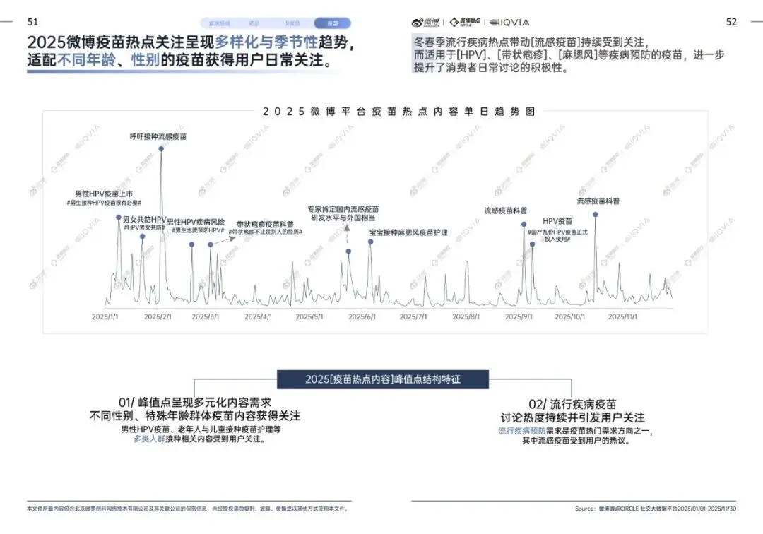 细分领域热点呈现多元化发展态势,疾病、药品、保健品、疫苗四大赛道各有亮点。疾病讨论打破认知壁垒,慢性疾病沟通更易懂,甲状腺结节、糖尿病等话题吸引年轻用户关注,同时 “小众” 疾病因与日常生活习惯相关持续出圈;药品讨论覆盖流感、过敏等场景,消费者自主选药意识提升,对创新药的效果与风险均高度关注;保健品受明星效应与内在需求双重驱动,成分精细化、剂型便捷化、口感趣味化成创新方向,软糖、滴剂等年轻化剂型备受青睐;疫苗话题呈现季节性与多元化特征,HPV 疫苗(尤其是男性接种)、带状疱疹疫苗、流感疫苗讨论度高,Z 世代高净值女性成为核心关注人群,接种安全性与效果是主要讨论焦点。