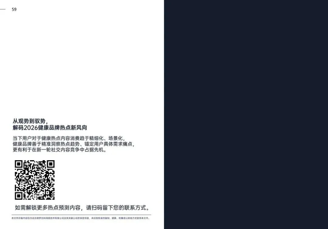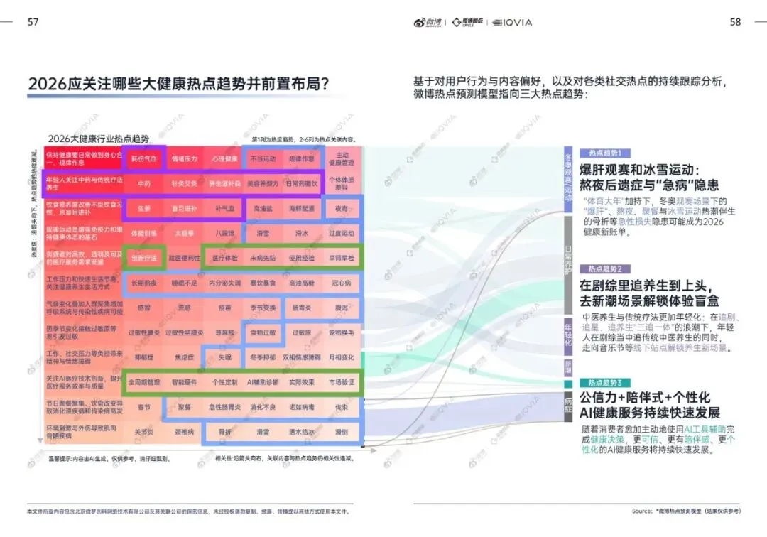 2026 年大健康行业热点趋势已现端倪,品牌需精准把握沟通契机。体育大年背景下,冬奥观赛带来的熬夜后遗症与冰雪运动相关急性损伤隐患将成热点;中医养生与传统疗法年轻化趋势明显,年轻人在剧综影响下主动尝试中药、针灸、药膳等方式;AI 健康服务将向更具公信力、陪伴感与个性化的方向发展,持续赋能消费者健康决策。此外,日常身心养护、季节性疾病预防、情绪压力管理等仍是长期热点,品牌可依托社媒平台,结合场景化内容与权威背书,精准触达目标用户。