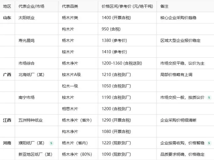核心区高位盘整,局部按需补库 山东作为北方木片市场核心区,昨日价格呈现整体趋稳态势。以山东太阳纸业为代表的头部浆企采购价未做调整,杨木片类开票价稳定在1400元/绝干吨,为市场树立了价格“锚点”。同时,寿光晨鸣等大型企业的收购价也保持不变,显示主流需求方态度谨慎。