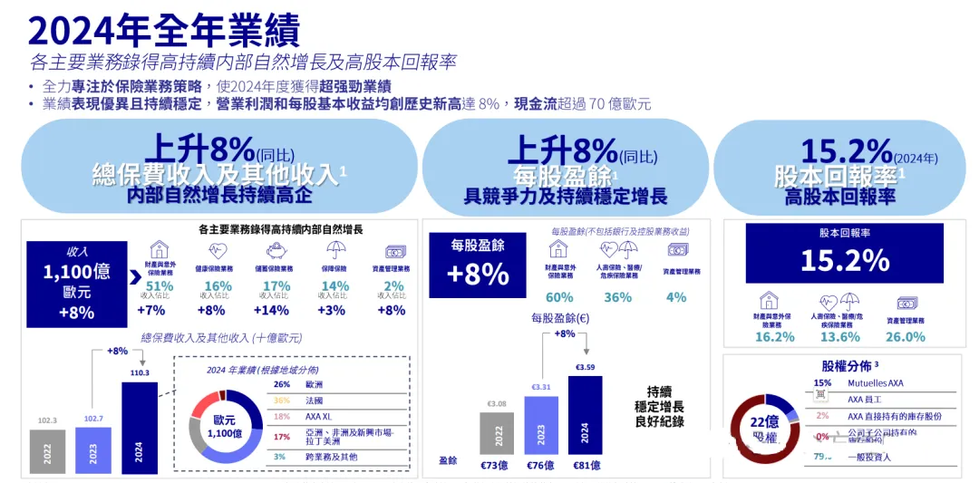 核心业务稳增长:寿险及健康险保费收入519.8亿欧元,占总营收47%,新业务利润509亿欧元(同比+24%),聚焦保障本质,拒绝短期投机。