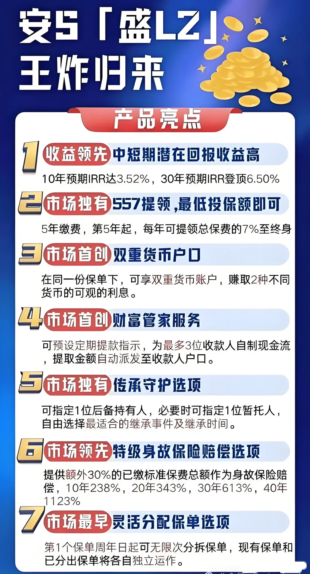 首创“557”终身提领:5年缴费后,第5个保单年度起每年可提领总保费7%至终身,最低投保额即可享受,精准适配教育金、养老金、创业金等现金流需求。