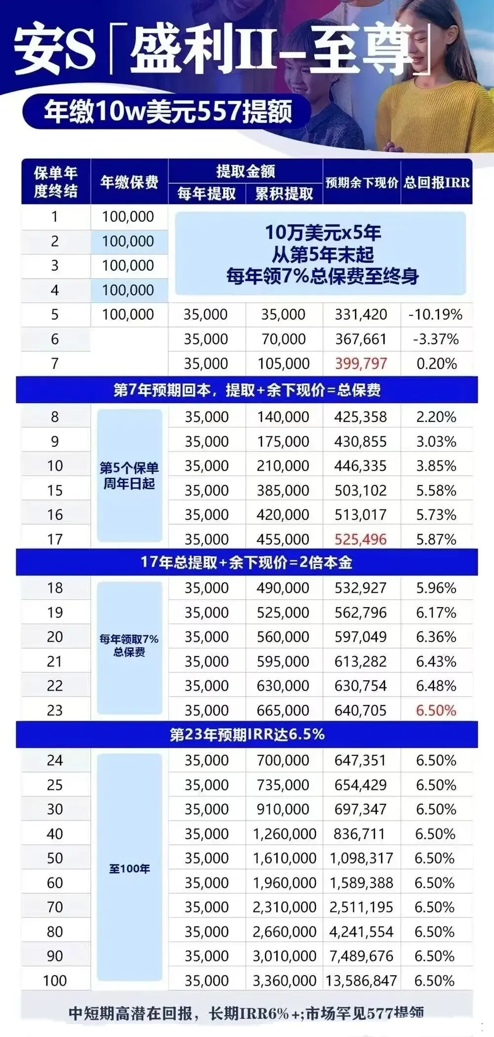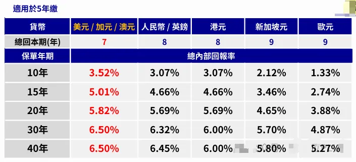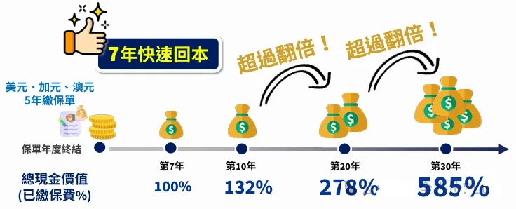 5年缴费期,支持多货币选择,7年即可快速回本,财富每10年翻一番。