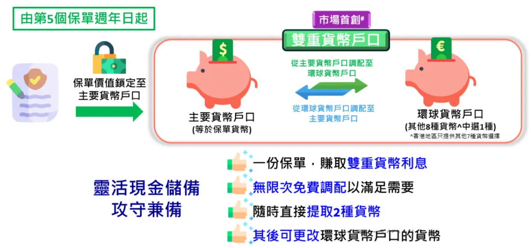 首创双重货币户口:第5年起可开设环球货币账户,实现双货币独立计息,支持无限次免费调配资金、跨货币提取,规避汇率波动风险。