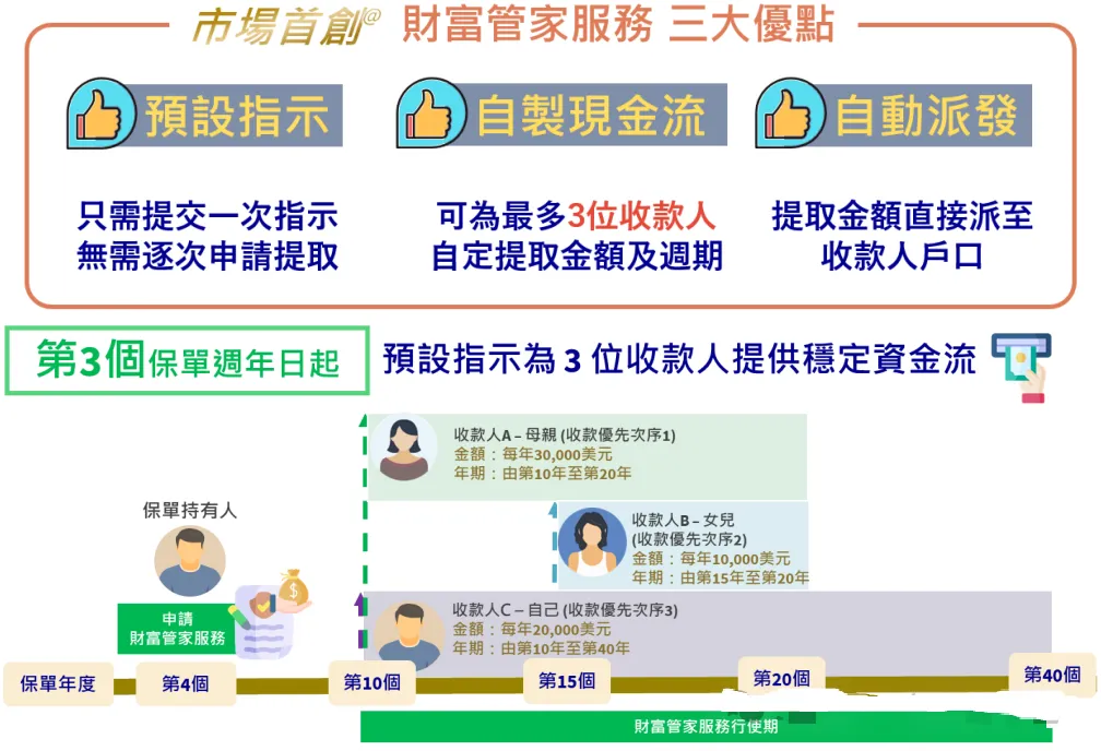 首创财富管家服务:第3年起可预设定期提取计划,为3名收款人定制提款规则,优先级独立运作,自动发放资,实现精准财富分配。