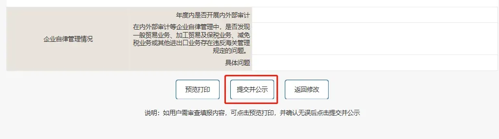 (三)年度报告内容填报完毕后,可通过预览并公示页面检查填报内容是否准确。确认无误,点击“提交并公示”按钮,完成年度报告报送,公示系统将自动向社会公示年度报告信息。企业如需纸质年度报告书用于存档的,可点击“预览打印”按钮打印年度报告书。