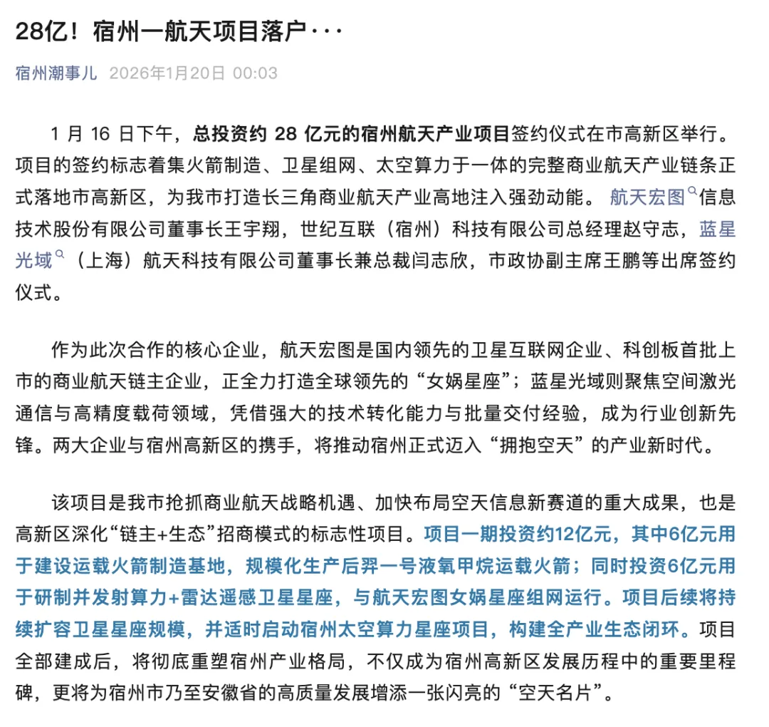 关键词:商业航天、航天宏图、宿州高新区、后羿一号、女娲星座、液氧甲烷火箭、星上算力