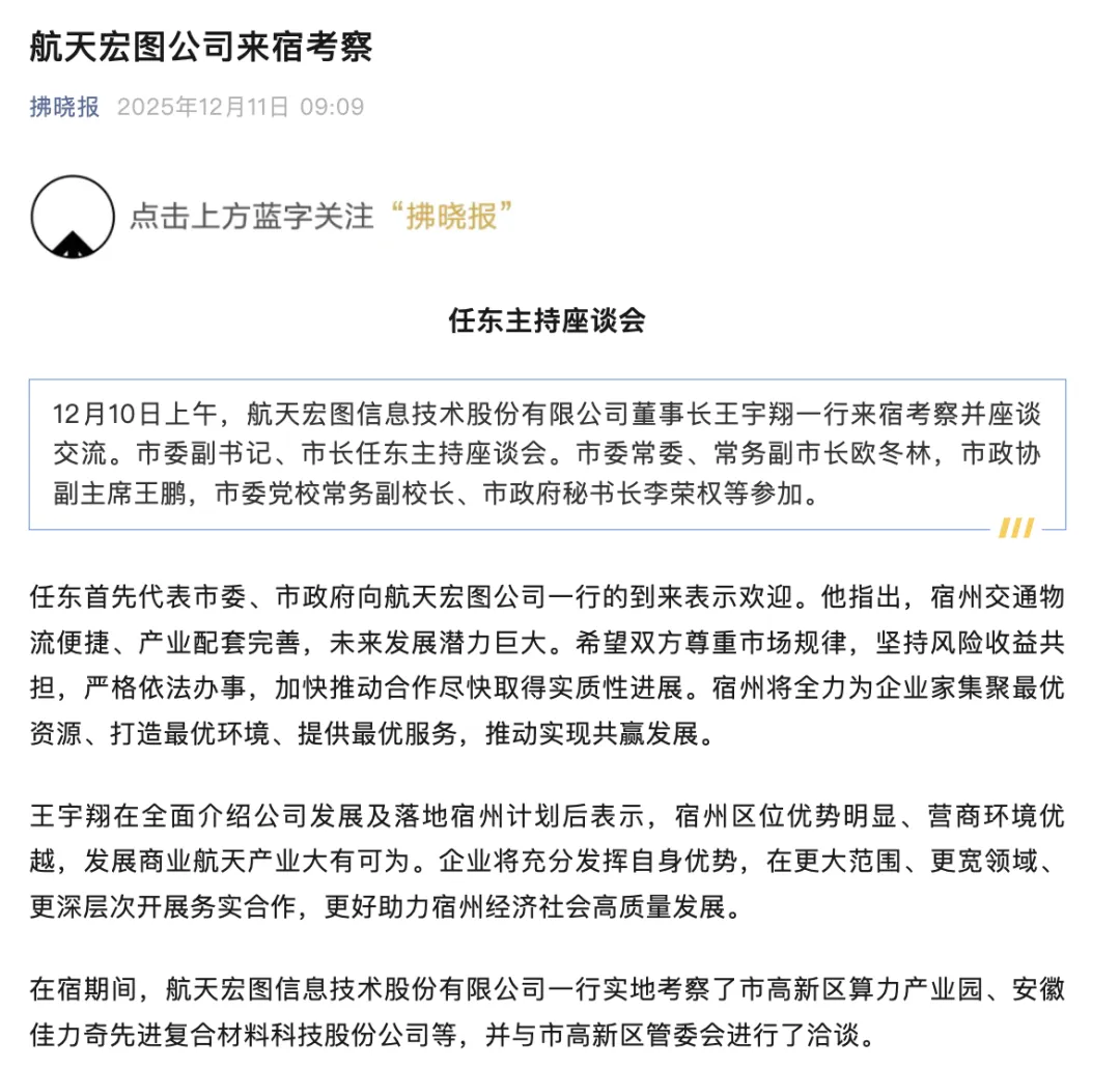 这一天,中国商业航天版图迎来了一次极具战略意义的重构。安徽宿州高新技术产业开发区(以下简称"宿州高新区")与科创板上市企业航天宏图信息技术股份有限公司(以下简称"航天宏图")正式签署《宿州航天产业项目投资合作协议》。这一事件不仅标志着宿州市从传统的"云都"算力中心向"空天地一体化"的高端制造领域迈进,更折射出在宏观经济承压与商业航天爆发期的双重背景下,头部企业与地方政府之间深度的资本捆绑与产业对赌逻辑。