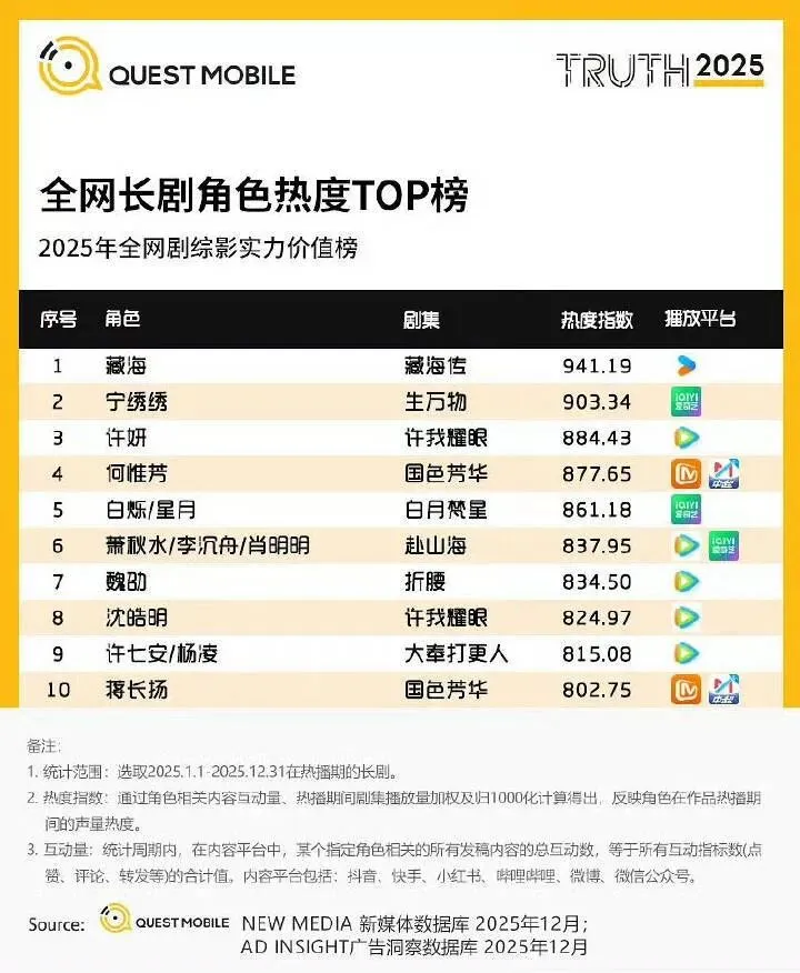 QuestMobile发布2025全网长剧播放量及角色热度榜,肖战领衔主演的《藏海传》及其角色藏海,以绝对优势包揽双榜第一!真正的爆款就是这样,无论哪个平台,无论怎样拉数据,都是第一。