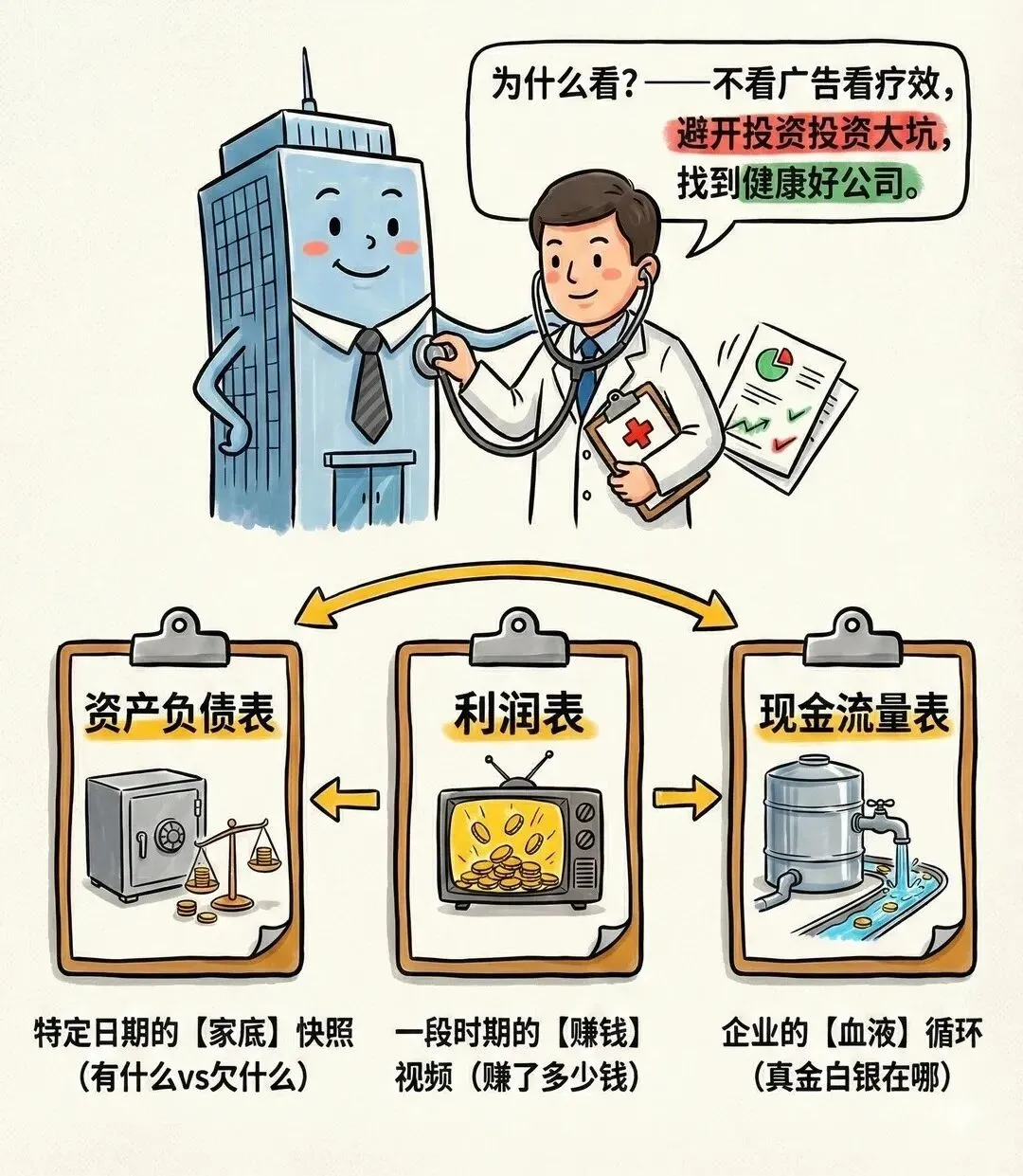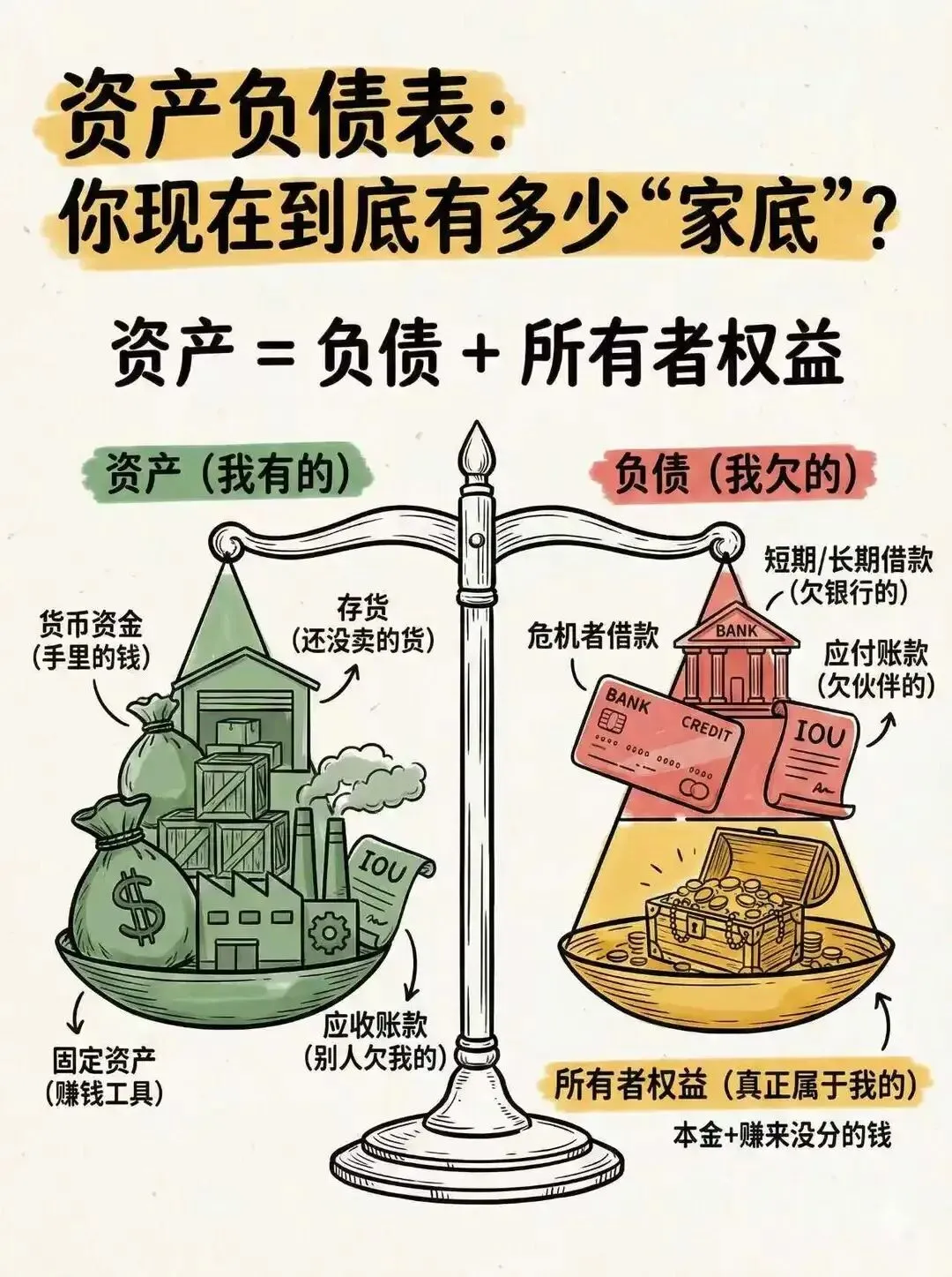 资产负债表:看“底子”——在某个时间点上,公司有多少家当(资产),欠了多少债(负债),真正属于股东的有多少(所有者权益)。关键在于理解 “资产结构”与“偿债风险”。
