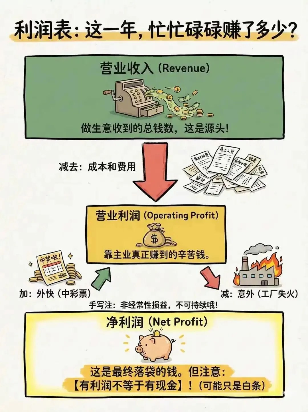 利润表:看“面子”——公司在一段时间内是赚是亏,赚钱的能力和趋势如何。核心是看营业收入的质量和净利润的含金量。
