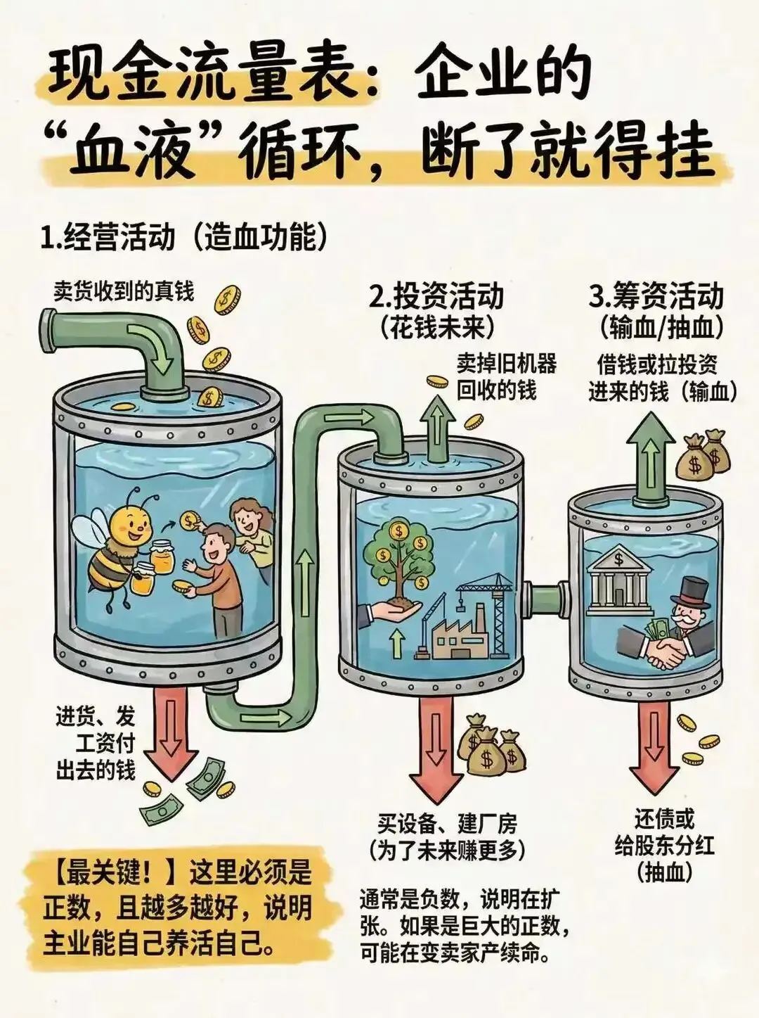 现金流量表:看“日子”——公司经营、投资、筹资活动实实在在流进流出多少现金。“现金为王”,利润可能美化,但持续的现金流入才是公司生存的血液。