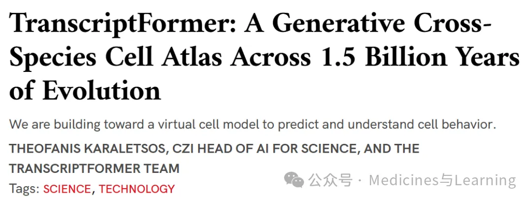 而另一项更具野心的计划来自 Chan Zuckerberg Initiative(CZI)。由 Steve Quake 与 Theofanis Karaletsos 领衔的团队在2025年推出 TranscriptFormer 模型。它的训练数据涵盖 12个物种、1.12亿个单细胞,包括人、小鼠、线虫、海绵、疟原虫等。