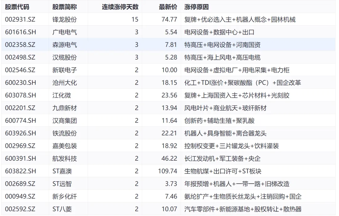 :锋龙股份(15连板,兼属)、铁流股份(2连板)。 - 国企改革/央企背景